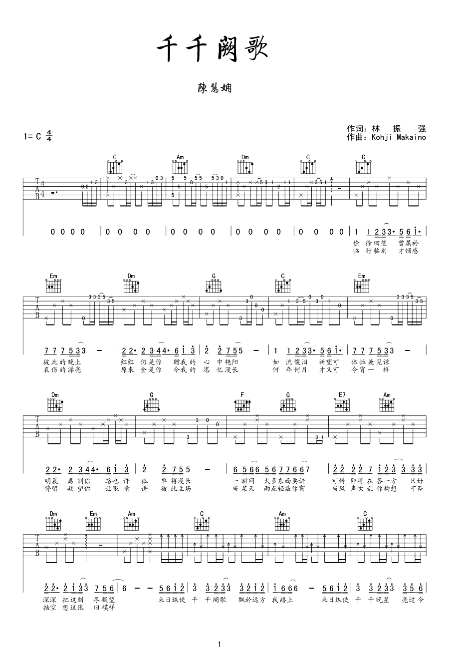 会员BET9登录网址-手机APP下载-易唱网echangwang.com 时间:2018-11-14 来源:尚乐舍 点击:次 陈慧娴千千阙歌吉他谱,C调和弦编配,六线谱高清版图片,中文流行歌曲里面的经典的作品,该曲选用日本歌星近藤真彦的歌曲《夕焼けの歌》(《夕阳之歌》)陈慧娴女声版和张国荣的男生版,都给歌迷留下了深刻而美好的回忆。 临别在即,唯有凭歌寄意,将心中的不舍和爱意诉诸歌声里。易唱网也为琴友们提供了不同的编配版本,希望喜欢这首粤语歌曲的朋友喜欢。曲谱图片可以打印收藏。