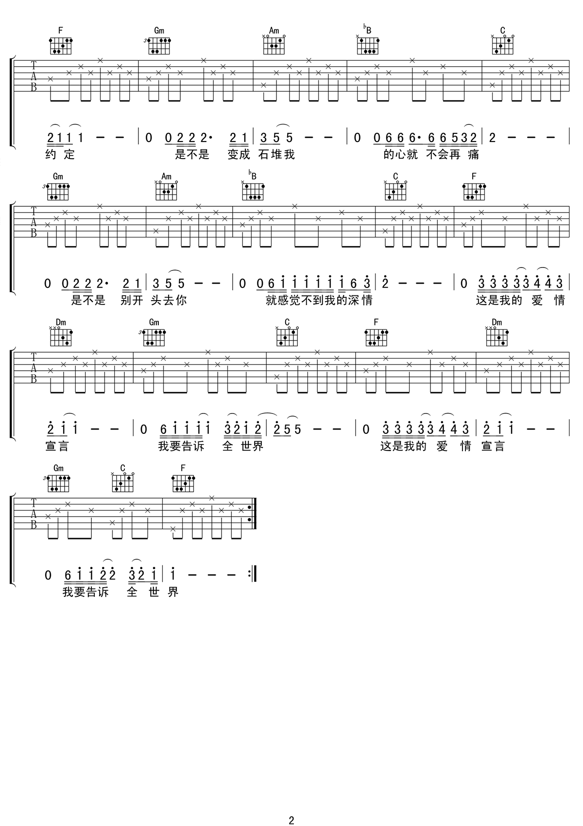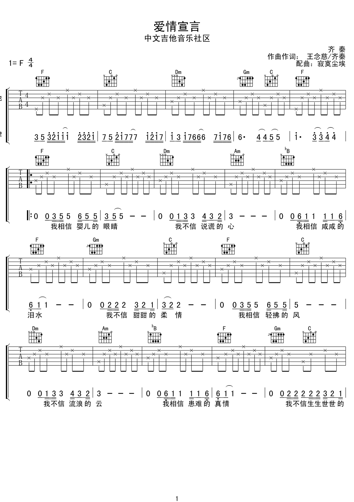 爱情宣言吉他谱 齐秦 F调指法 高清图片谱 时间:2018-01-23 来源:寂寞尘埃 点击:次 爱情宣言吉他谱,齐秦九零年代发行的经典老歌,爱情宣言吉他弹唱谱。高清图片六线谱。F调指法编配。感谢寂寞尘埃配曲分享。易唱网整理上传。 真挚而又坦荡的歌声唱出对爱情的忠贞和承诺。一段刻骨铭心的爱情是美好的,可不一定都能有童话般的结果,也如此才被人们向往和憧憬,燃烧青春绽放生命去追求爱情。