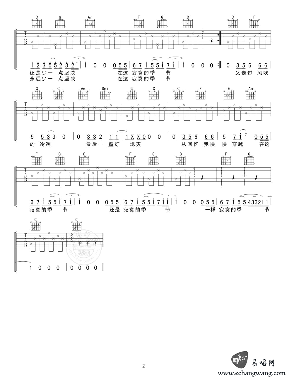 寂寞的季节吉他谱 C调简单版 陶喆 弹唱谱六线谱 时间:2017-06-27 来源:Hero 点击:次 寂寞季节吉他谱,陶喆一首非常适合吉他伴奏的经典歌曲。歌曲原调#C,CAPO夹一品选用C调指法。寂寞的季节吉他弹唱谱,图片谱高清版,六线谱编配格式,寂寞的走过四季的人啊,看着整条街都是恋爱的人,看着别人爱情盛开的热烈,可是说好了过去了怎么还是放不下呢。从别后再无春秋冬夏,只剩寂寞的季节。