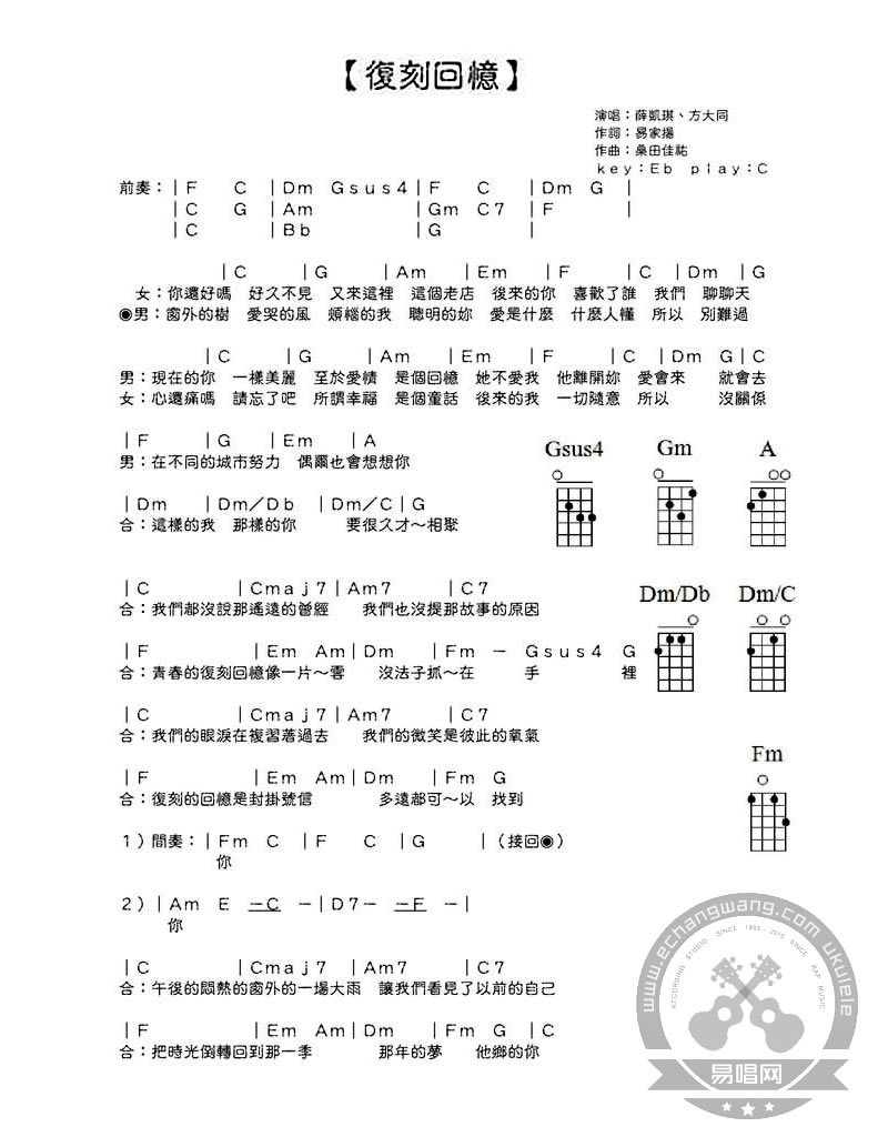 复刻记忆尤克里里谱,方大同薛凯琪演唱,原调Eb选调C,复刻记忆ukulele谱。