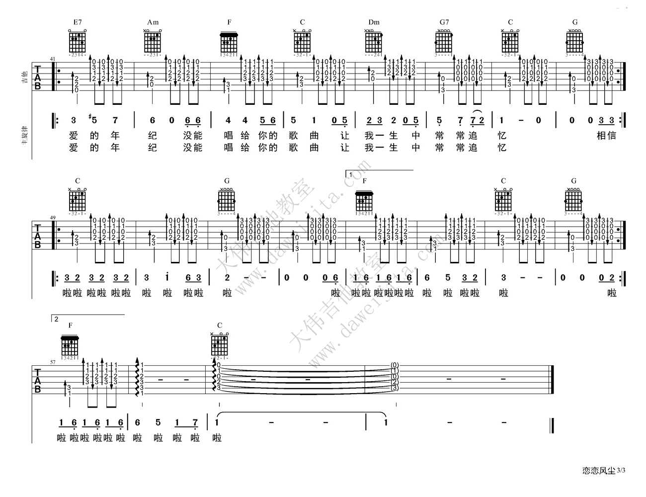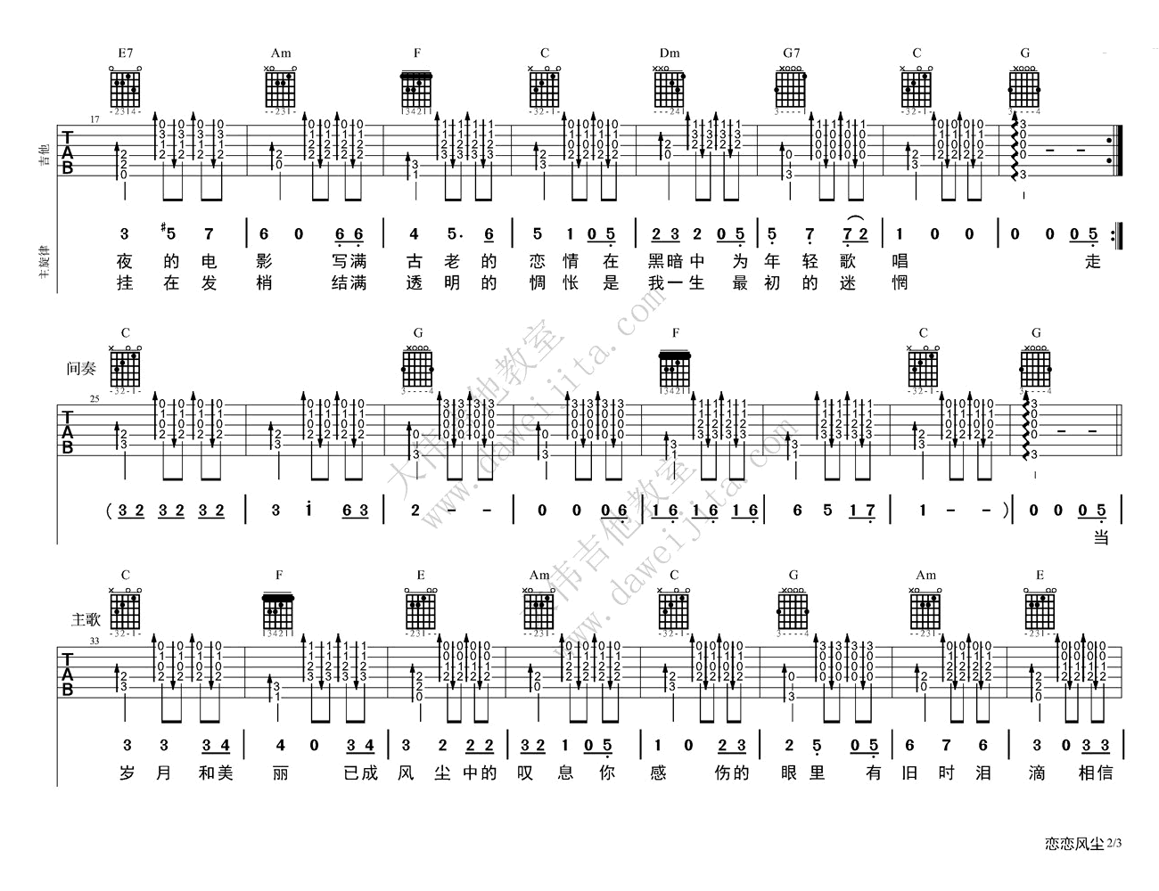 恋恋风尘吉他谱_老狼_恋恋风尘C调弹唱谱 时间:2014-12-07 来源:大伟 点击:次 老狼《恋恋风尘》吉他谱,本曲为E调,变调夹夹第四品采用C调指法,恋恋风尘吉他六线谱,和主旋律的简谱部分,八分音符都演奏或演唱为三连音。“敢爱青春”高晓松作品演唱会,校园民谣时代经典歌曲再度回首,青葱岁月的爱恋、纯真年代的疯狂、懵懂无知的情怀、白衣飘飘的回忆,成为多年之后心底最柔软的记忆。 恋恋风尘吉他弹唱讲解视频示范