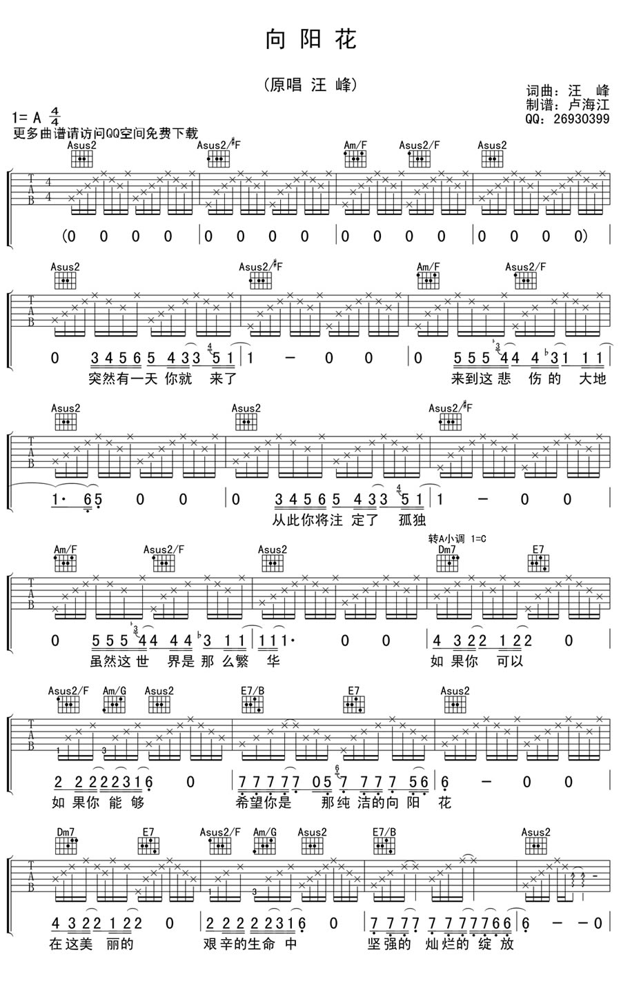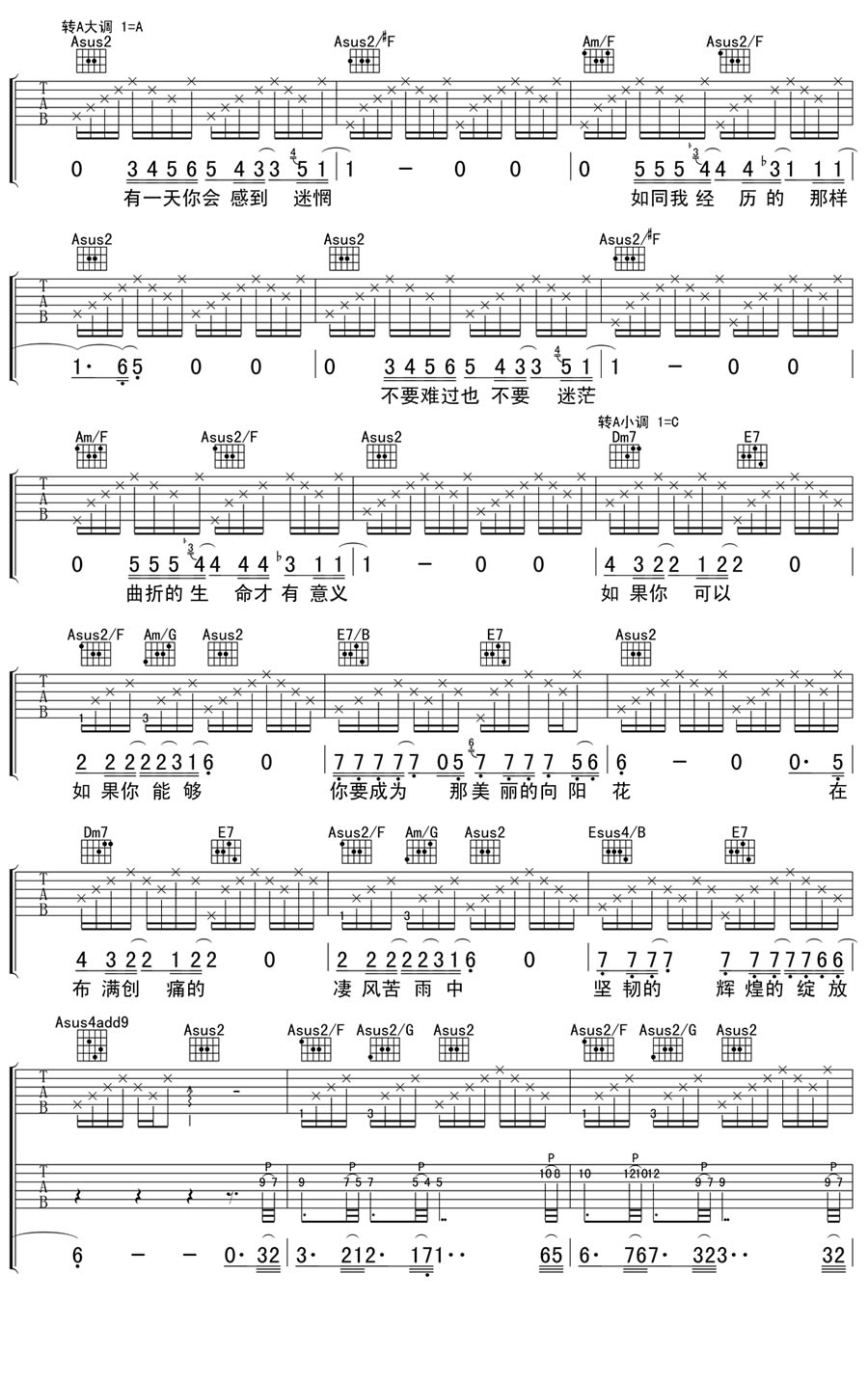汪峰《向阳花》吉他谱_给女儿的歌_弹唱谱完整版 时间:2016-09-14 来源:卢海江 点击:次 汪峰《向阳花》吉他谱,A调指法编配,向阳花六线谱,完整版高清图片谱,共四张谱例两页显示。汪峰温情写给女儿熙熙的一首歌,表达出对孩子最深的祝愿,粗犷的声音能唱出心里最柔弱的细腻的情感。汪峰吉他谱收藏推荐。尽在易唱网。 共2页: 上一页12下一页