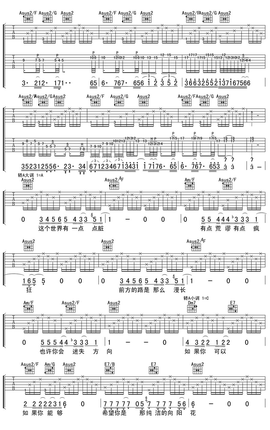 汪峰《向阳花》吉他谱_给女儿的歌_弹唱谱完整版(2) 时间:2016-09-14 来源:卢海江 点击:次 向阳花吉他谱,汪峰演唱,一首为女儿创作的歌曲。曲谱编配辛苦,感谢卢海江老师扒谱制作。当前页面显示的是《向阳花》三、四张图片谱例。 共2页: 上一页12下一页