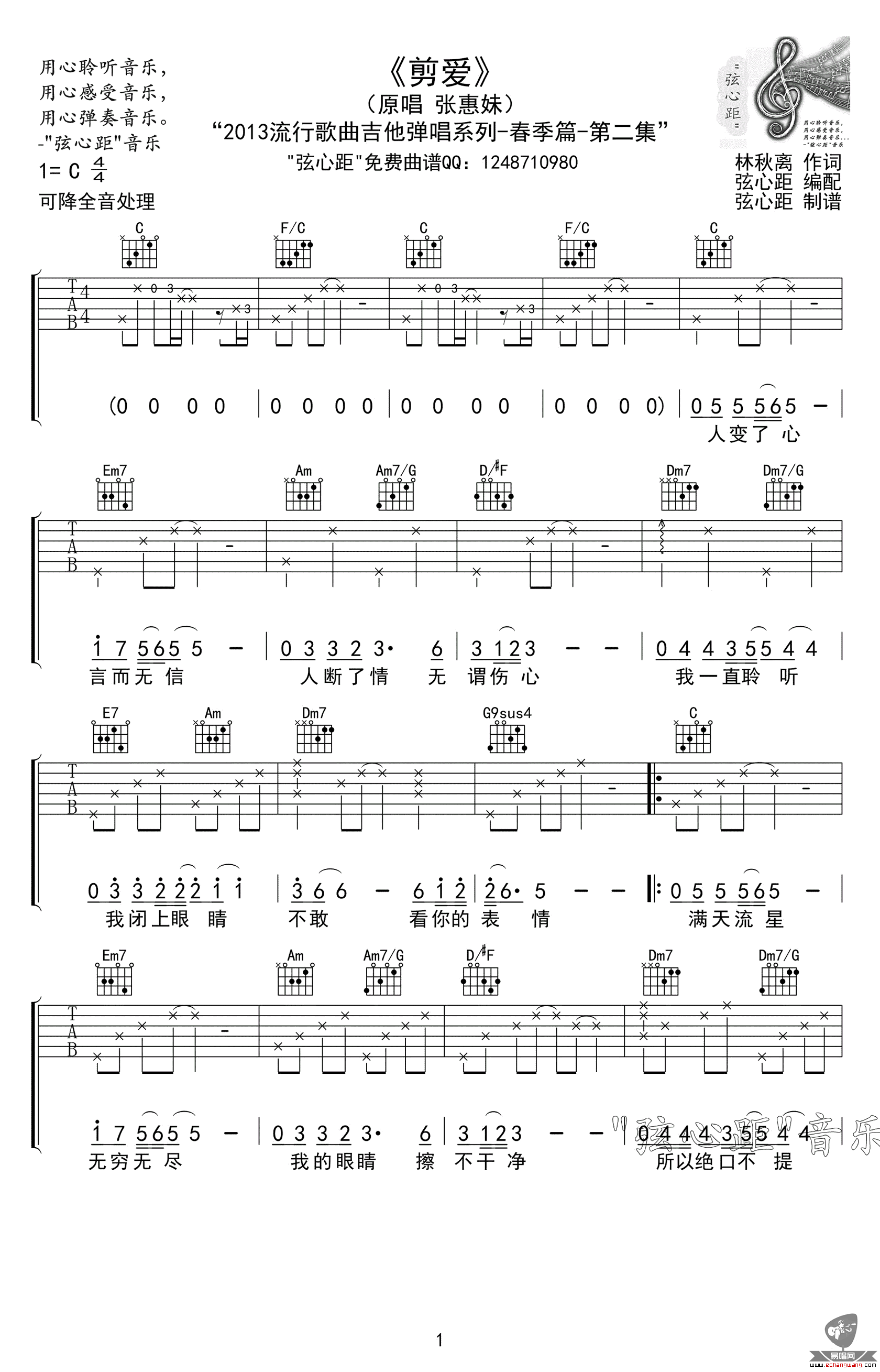 剪爱吉他谱 张惠妹 C调高清弹唱谱 图片谱 时间:2017-05-06 来源:弦心距 点击:次 剪爱吉他谱,张惠妹的成名曲,经典情歌弹唱谱。剪爱吉他六线谱,曲谱在改编成吉他伴奏时,进行了适应民谣吉他的改编。更加方便女生弹唱的C调版本,如果你是男生,请将琴弦降全音调整。