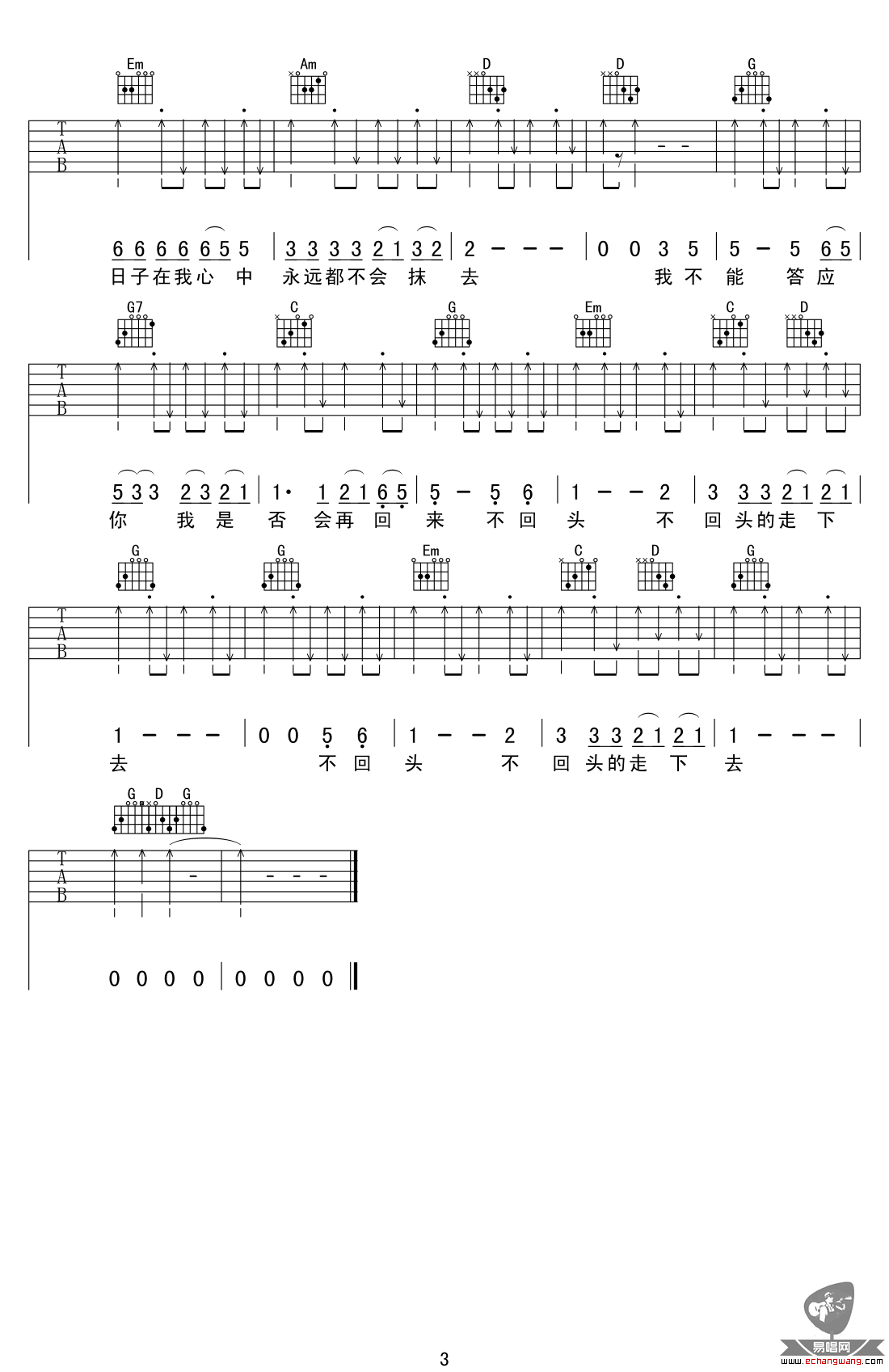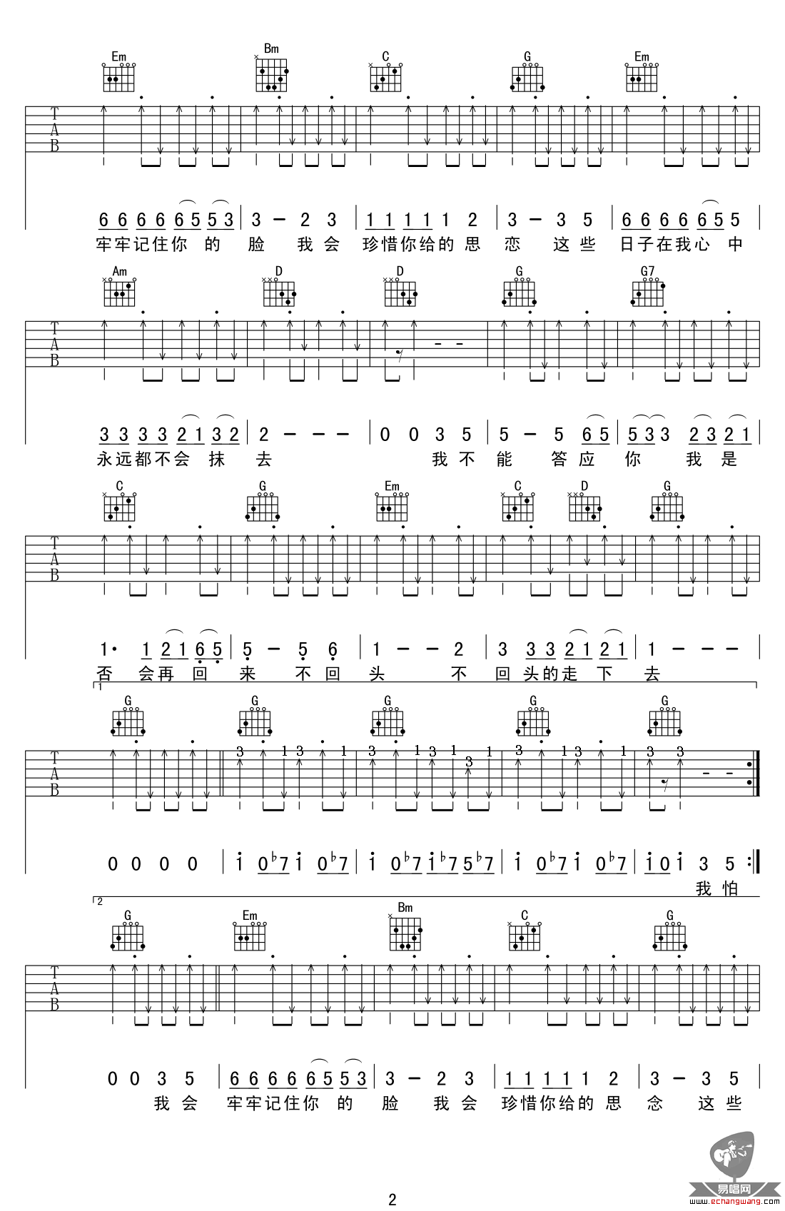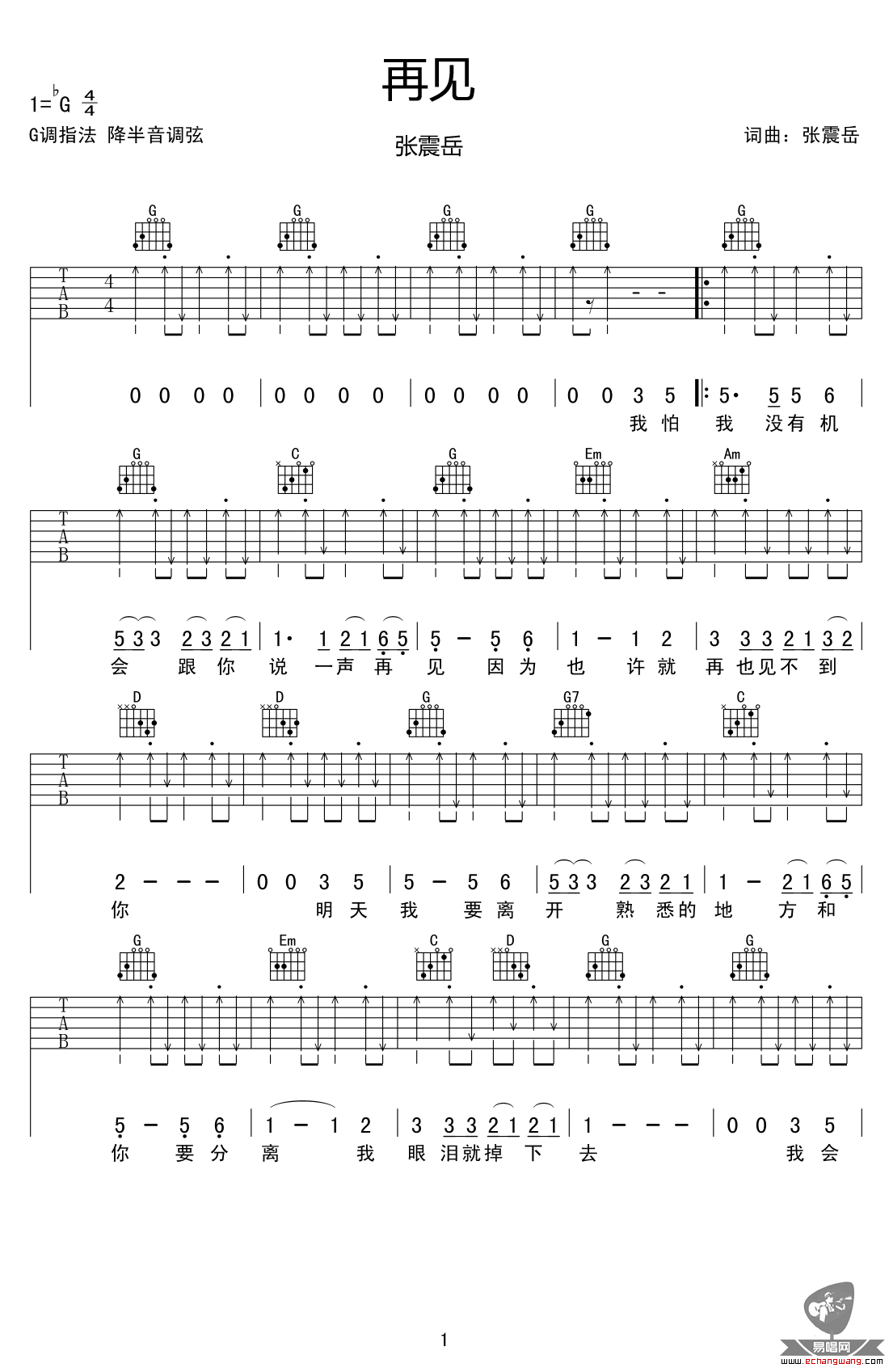 张震岳《再见》吉他谱 吉他扫弦版本 G调弹唱谱 时间:2017-05-05 来源:LEO5072 点击:次 再见吉他谱,张震岳的一首经典歌曲,《再见》吉他弹唱谱,六线谱高清版本。曲谱三张图片谱例,原调降G选调G,采用降半音调弦。易唱网www.echangwang.com推荐收藏。