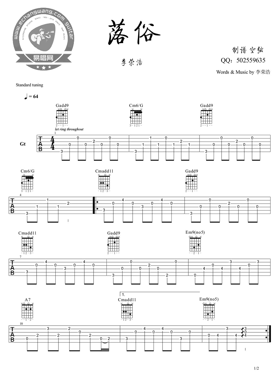 落俗吉他谱 李荣浩 弹唱谱 图片谱高清版 时间:2017-06-11 来源:空弦 点击:次 落俗吉他谱,李荣浩演唱,六线谱编配,落俗吉他弹唱谱,两张图片高清谱。李荣浩吉他谱,曲谱为TAB格式图片谱。感谢空弦制谱,易唱网上传收藏。“唱情歌落俗,说爱又太苦。”李荣浩的《落俗》轻摇滚里的慢板抒情,经典的“李式唱腔”将情爱结合情歌,用别样的方式有感而发的诉说眼中落俗。