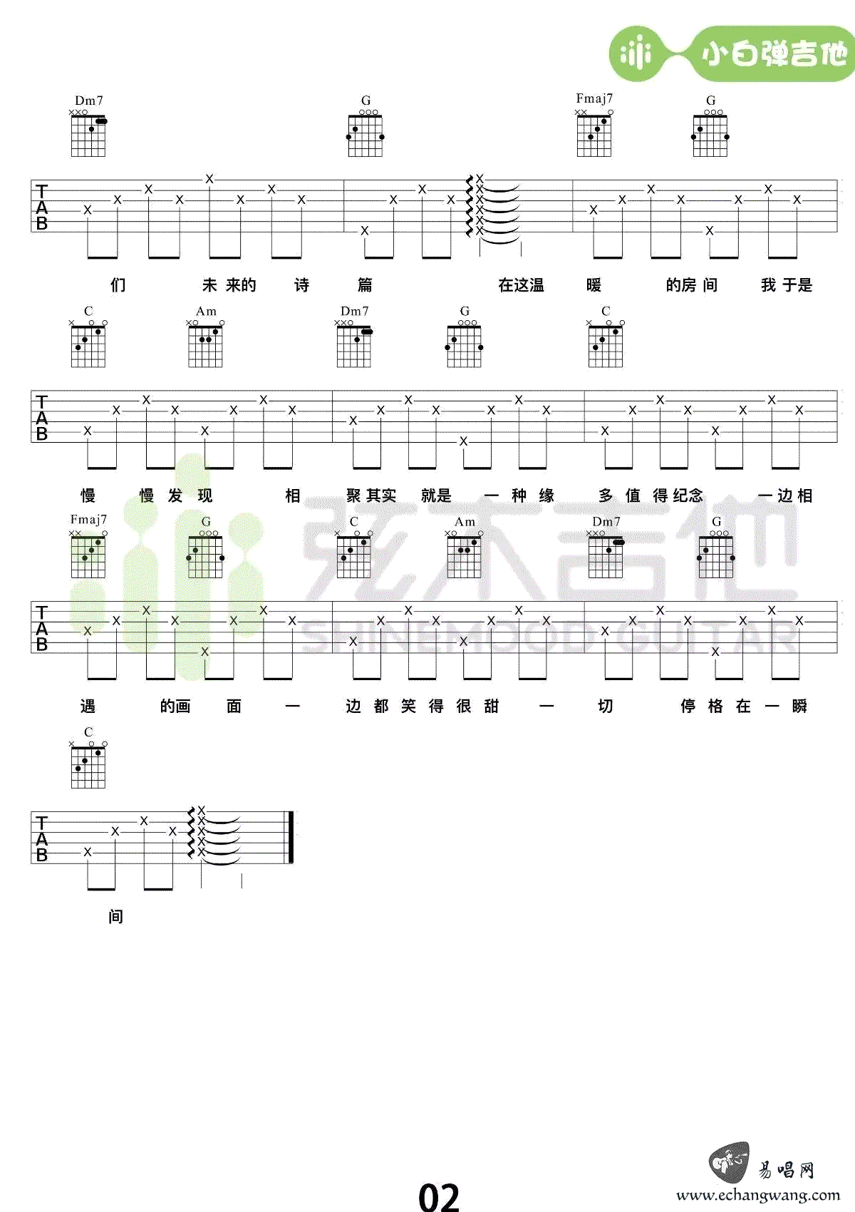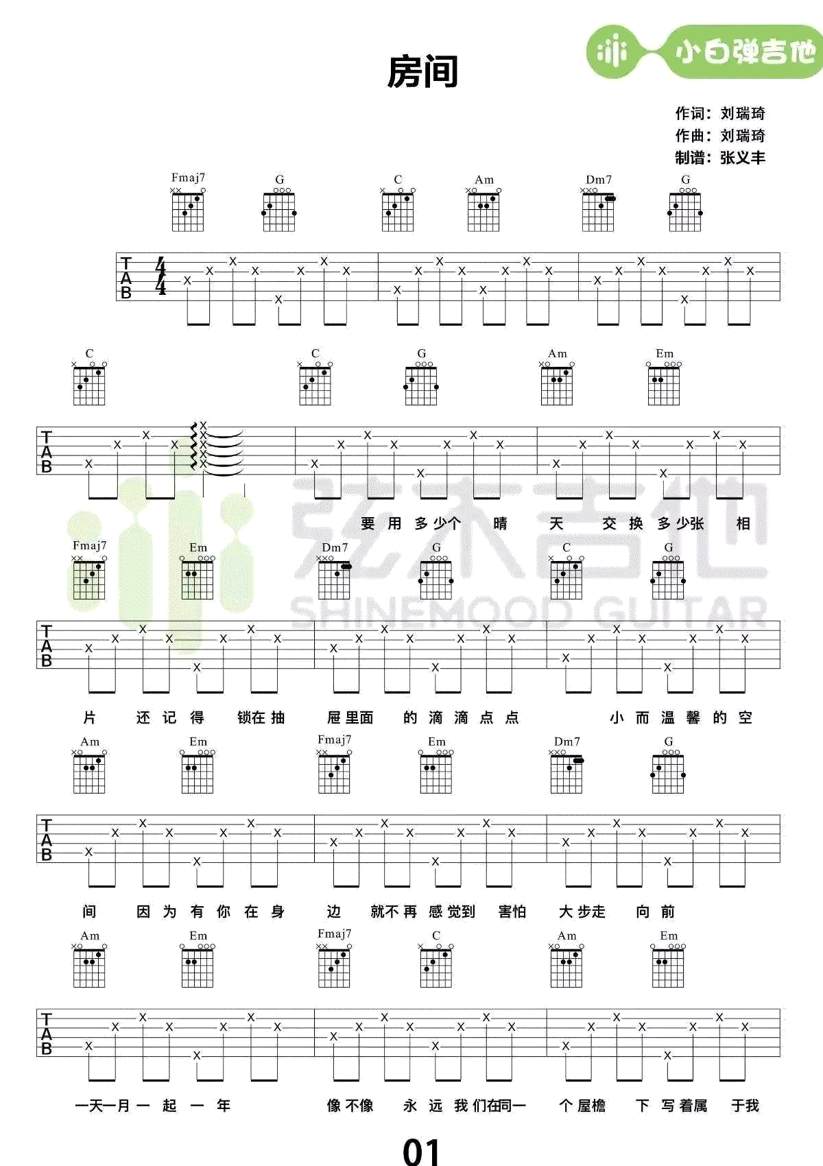 房间吉他谱 刘瑞琪 房间六线谱 吉他弹唱教学视频 时间:2017-08-02 来源:弦木吉他 点击:次 房间吉他谱,创作女歌手刘瑞琪词曲的一首好听的歌曲,房间吉他弹唱谱,高清图片谱,弦木吉他编配,并提供配套吉他弹唱教学视频。 陪伴,是一件温暖的事儿。那些一起走过的晴天,一起咧嘴笑过的青春,变成一张张旧照片,成为最远却又触手可及的梦。“一天一月一起一年 像不像永远” “相聚其实就是一种缘 多值得纪念” 那些笑声总是很甜,眼泪也落地有声。其实,我总爱说一切都是最好的安排,做什么事儿,遇见谁,成为怎样的自己。无论结局怎样,都好好地纪念。