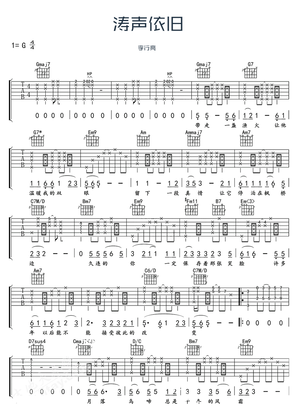 BOB体育官方入口-手机APP下载-易唱网echangwang.com 时间:2017-06-16 来源:网络 点击:次 涛声依旧吉他谱,G调指法,毛宁原唱的一首经典老歌,李行亮改编版本《涛声依旧》吉他弹唱谱,高清图片六线谱。如果说旧时光总是温暖的,那旧感情呢?是否那个存在于过往的人一直在安静地陪着你,陪着你怀念那些关于爱情的记忆。总有浅浅歌声,将那些刻骨铭心的爱淡淡的抚平,一曲涛声依旧,浅吟轻唱那经过多年风雨漂零,仍埋藏在心底的炽热。 w