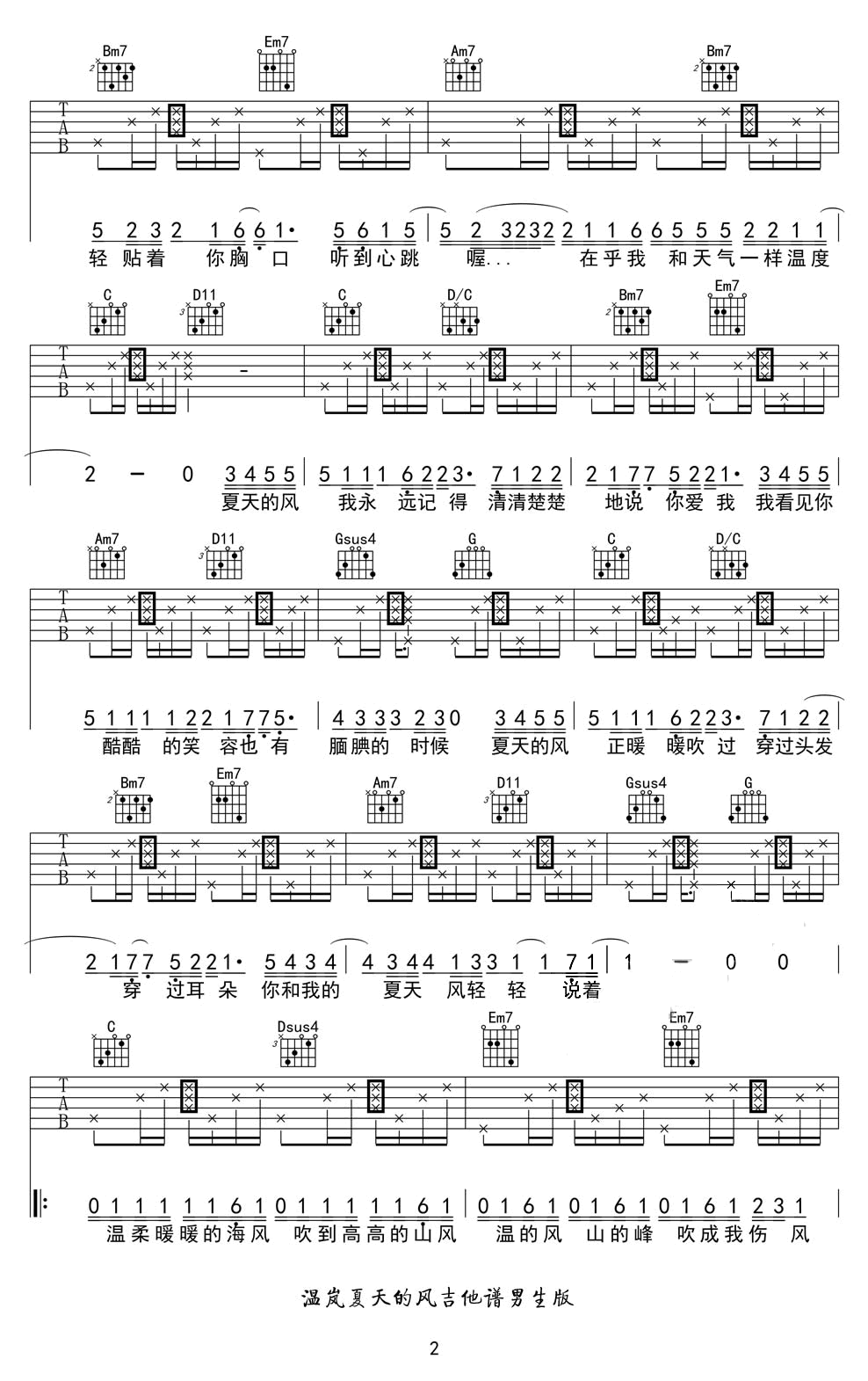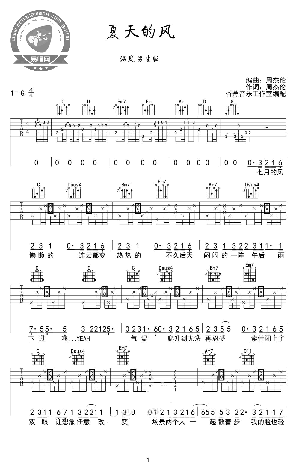 夏天的风吉他谱 G调男声版 温岚 高清弹唱谱 时间:2017-06-11 来源:香蕉音乐 点击:次 夏天的风吉他谱,周杰伦词曲创作,温岚演唱的一首经典代表歌曲,夏天的风吉他弹唱谱,男生版G调指法,高清图片谱。舒缓的旋律,安静唱出夏天的恋爱滋味,伴着起伏悦耳的吉他琴声弹唱给爱的人。感谢香蕉音乐工作室编配,易唱网收藏分享。