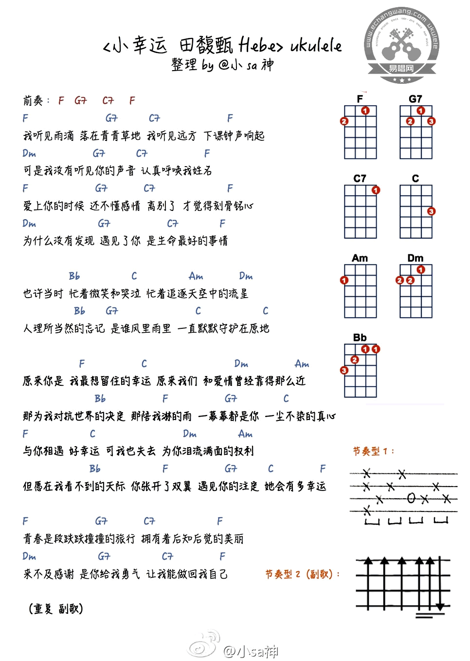 小幸运ukulele谱 田馥甄《小幸运》尤克里里弹唱 教学视频 时间:2017-07-06 来源:小Sa神 点击:次 小幸运ukulele谱,田馥甄演唱,台湾电影《我的少女时代》主题曲,小幸运尤克里里谱,清新动听的歌声,让人回忆自己曾经的青涩而美丽的初恋,本曲谱为小Sa神乌克丽丽编配,和弦与节奏参见图片谱,随谱附上《小幸运》ukulele弹唱教学视频。