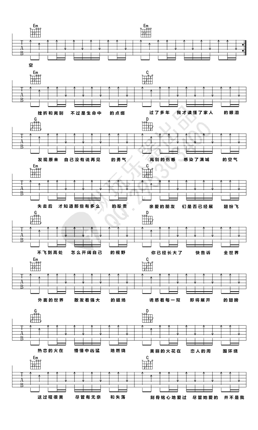 我的天空吉他谱 南征北战 弹唱谱六线 图片谱 时间:2017-06-20 来源:纵玩 点击:次 我的天空吉他谱,南征北战演唱的一首摇滚歌曲,我的天空吉他弹唱谱,三张图片谱.歌曲编配降B调,变调夹夹三品,纵玩乐器猫哥编排。南征北战乐队这首大热的歌曲是献唱我是《青春派》的电影主题曲。也是一首歌送给毕业季和在职场打拼、为梦想坚持不懈的你,愿你在奔向梦想的路上,有着侠客收剑入鞘的骄傲。