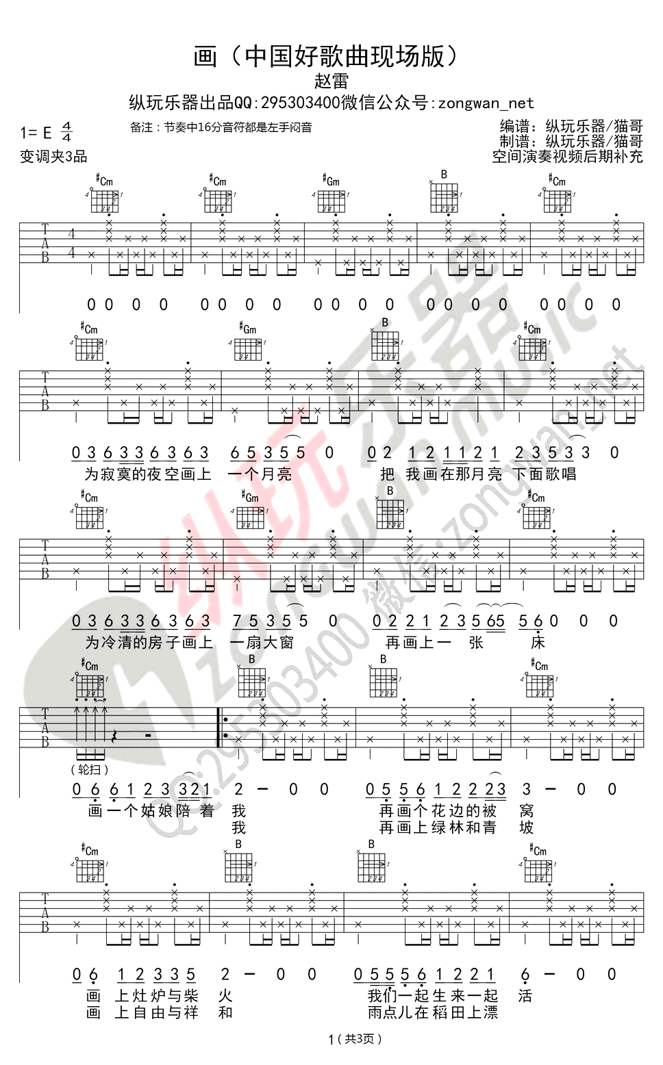 赵雷《画》吉他谱_中国好歌曲现场版_弹唱谱 时间:2016-06-30 来源:纵玩乐器 点击:次 赵雷画吉他谱,根据中国好歌曲现场版编配,画吉他六线谱,E调变调夹夹三品,节奏中16分音符都是左手闷音。赵雷的画吉他弹唱谱,一曲心灵感悟的民谣歌曲。那轻快而又伤感的音质令人陶醉,唱出每一个鲜活小民温暖的生活画卷和心底梦想。