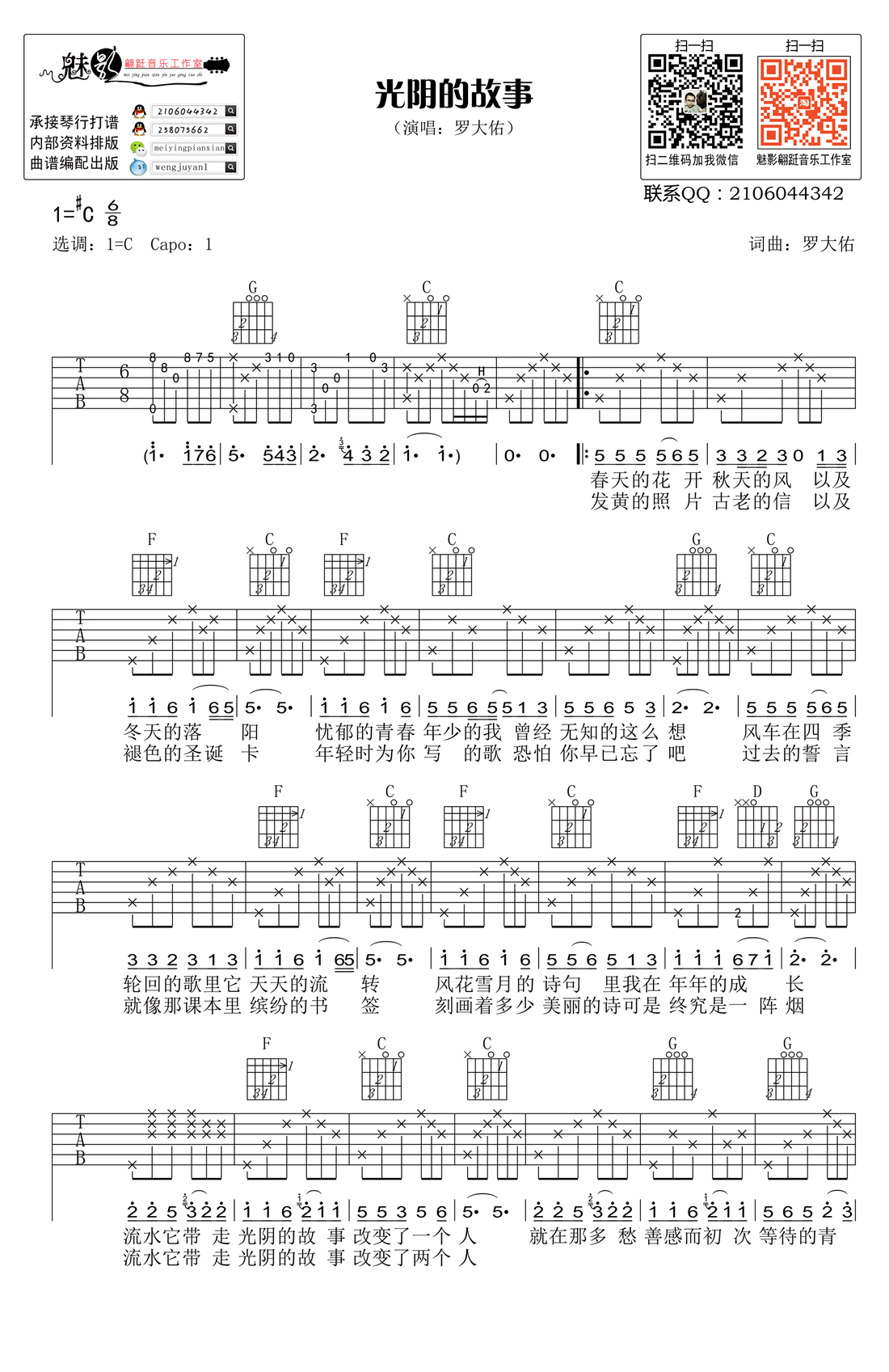 万博体育官网网页版登录-手机APP下载-易唱网echangwang.com 时间:2016-12-18 来源:魅影翩跹音乐工作室 点击:次 罗大佑《光阴的故事》吉他谱,原调#C调,变调夹夹一品,选用C调指法。光阴的故事吉他弹唱谱,高清图片谱,六线谱共三张图片谱例。罗大佑这首歌曲,从一个人”到“两个人”再到“我们”,从“初次等待”到“初次流泪”到“初次回忆”, 几乎相同的旋律,只是几个词汇的变动,就把光阴的流转和用情的深挚,勾勒得惟妙惟肖。熟悉的旋律,触动我们最柔软的青春回忆。
