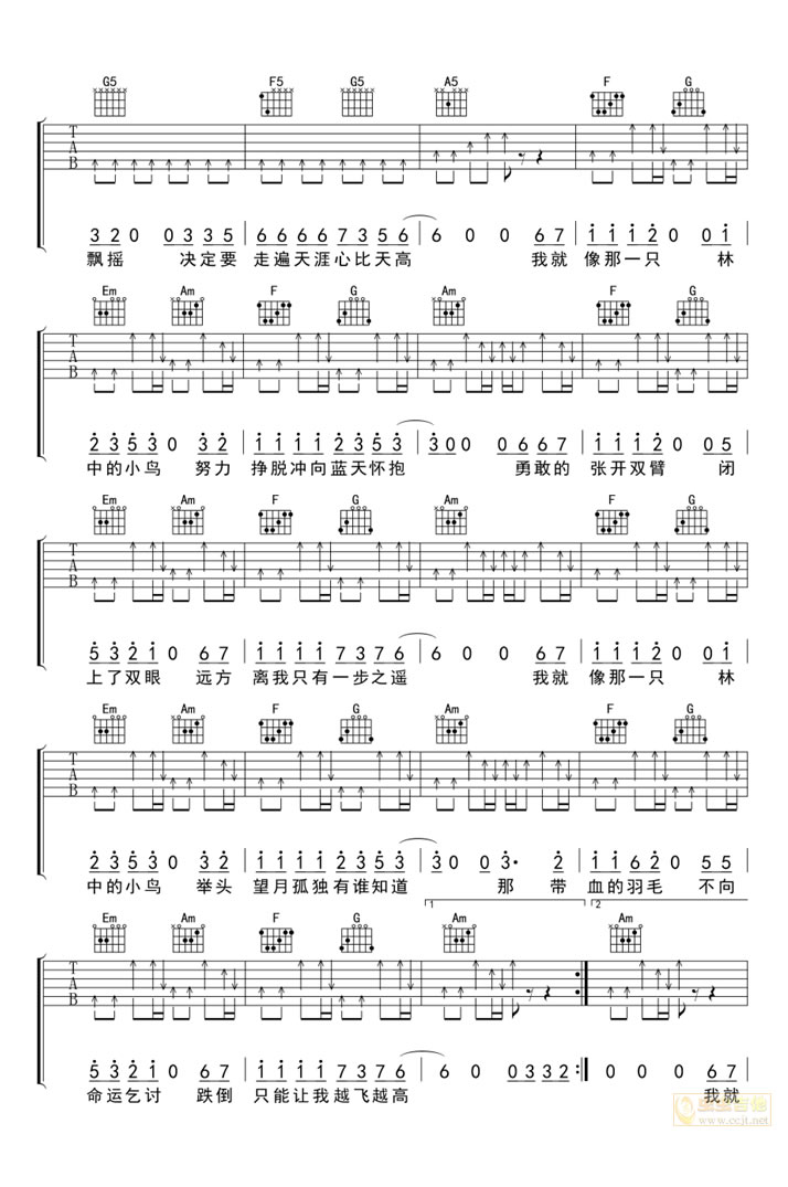 葛林《林中鸟》吉他谱,C调指法编配,一首让人激昂向上的正能量歌曲。林中鸟六线谱,弹唱谱三张图片。
