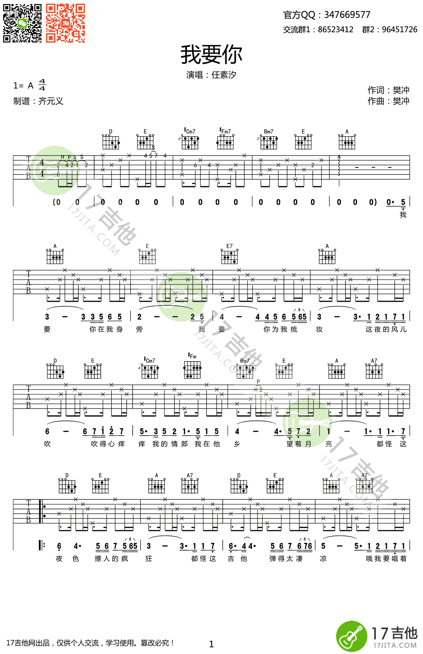 《我要你》吉他谱 任素汐 A调带前奏 高清弹唱谱 时间:2017-04-29 来源:齐元义 点击:次 我要你吉他谱,A调指法,带前奏编配,六线谱高清版本,两张图片谱例。我要你吉他弹唱谱,任素汐演唱《驴得水》电影主题曲,齐元义编配,易唱网上传。