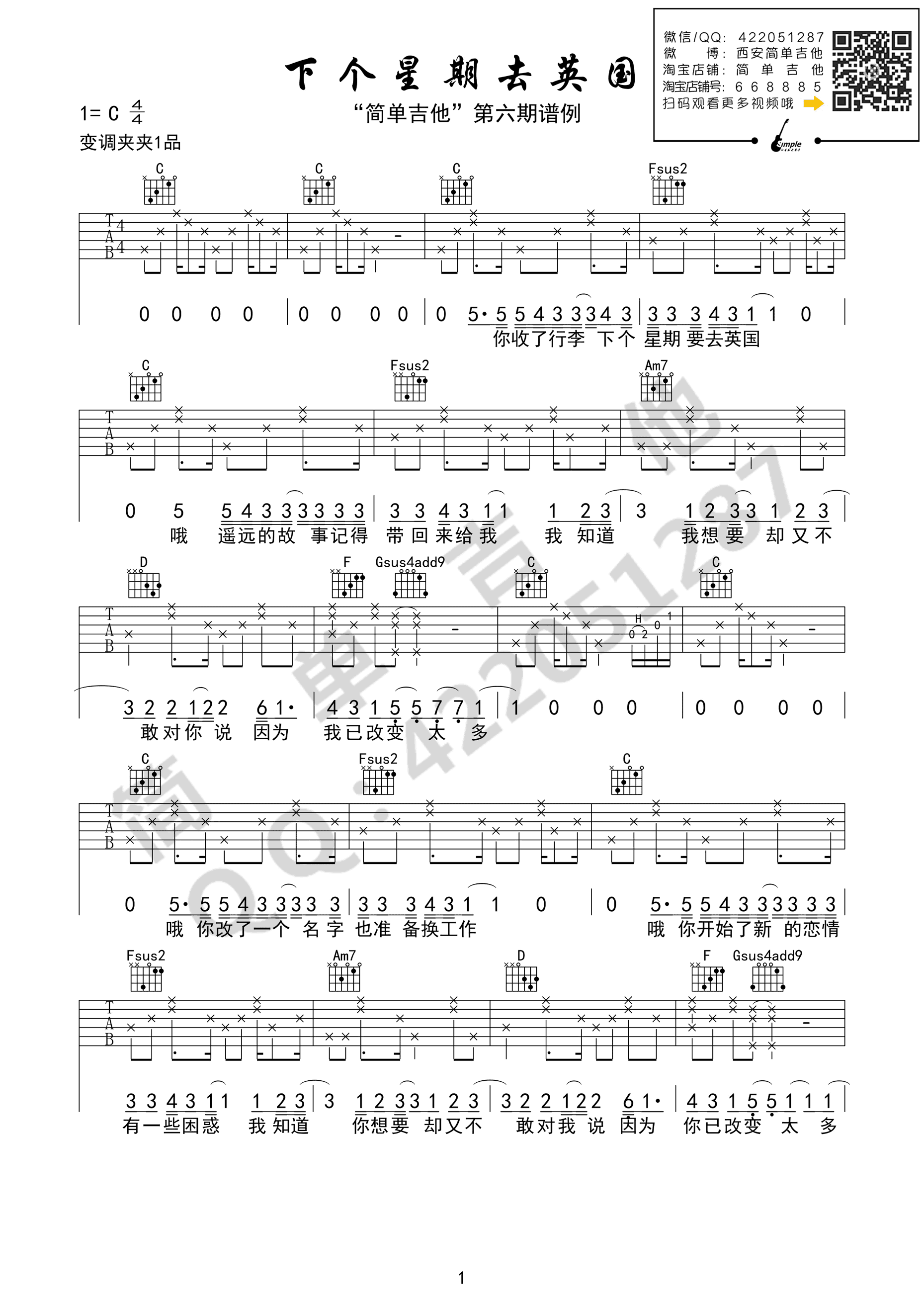 下个星期去英国吉他谱 陈绮贞 C调弹唱谱 简单吉他 时间:2017-05-02 来源:简单吉他 点击:次 陈绮贞《下个星期去英国》吉他谱,C调指法,变调夹夹一品,下个星期去英国六线谱,高清弹唱谱,两张图片谱例,简单吉他编配,易唱网上传分享。
