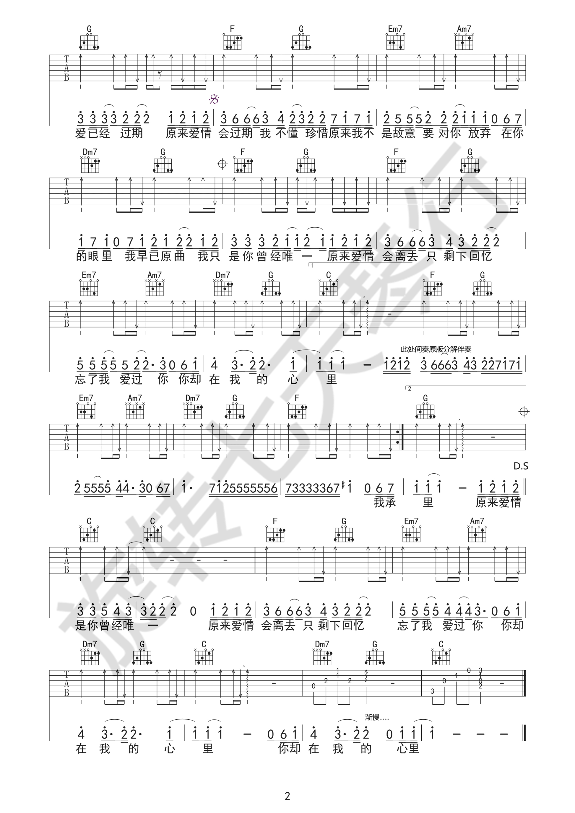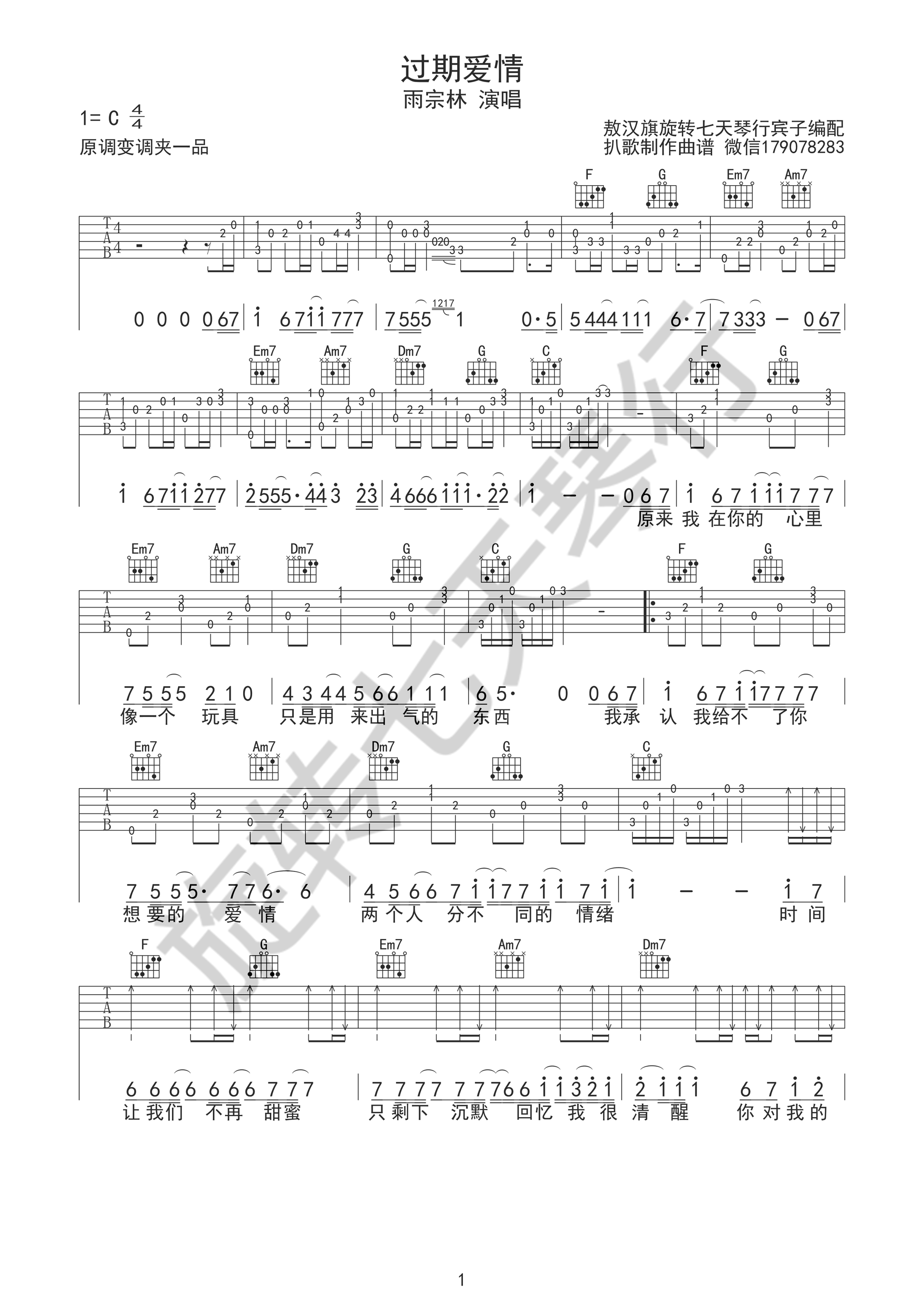 雨宗林《过期爱情》吉他谱 最美的时光片尾曲 弹唱谱 时间:2017-05-08 来源:宾子 点击:次 过期爱情吉他谱,雨宗林演唱,《最美的时光》电视剧主题曲,过期爱情吉他弹唱谱,C调指法编配,六线谱高清图片谱,变调夹夹一品,感谢宾子扒歌制作曲谱,易唱网分享。