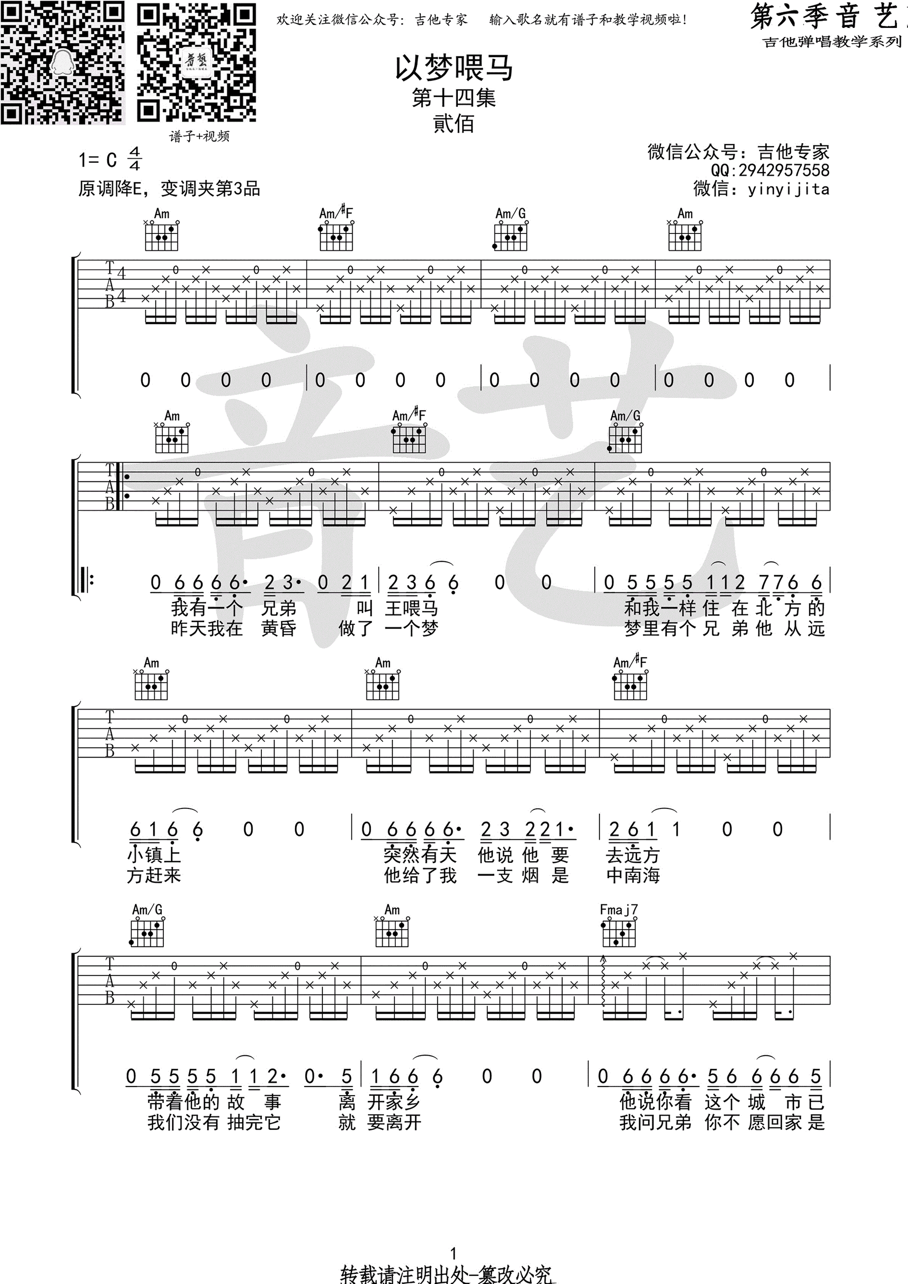 贰佰《以梦喂马》吉他谱 C调六线谱 弹唱谱高清版 时间:2017-05-10 来源:音艺吉他 点击:次 贰佰以梦喂马吉他谱,六线谱弹唱谱,C调指法编配,CAPO夹三品,音艺吉他出品。贰佰词曲演唱的一首民谣歌曲,以梦喂马吉他谱,高清图片谱。 共2页: 上一页12下一页