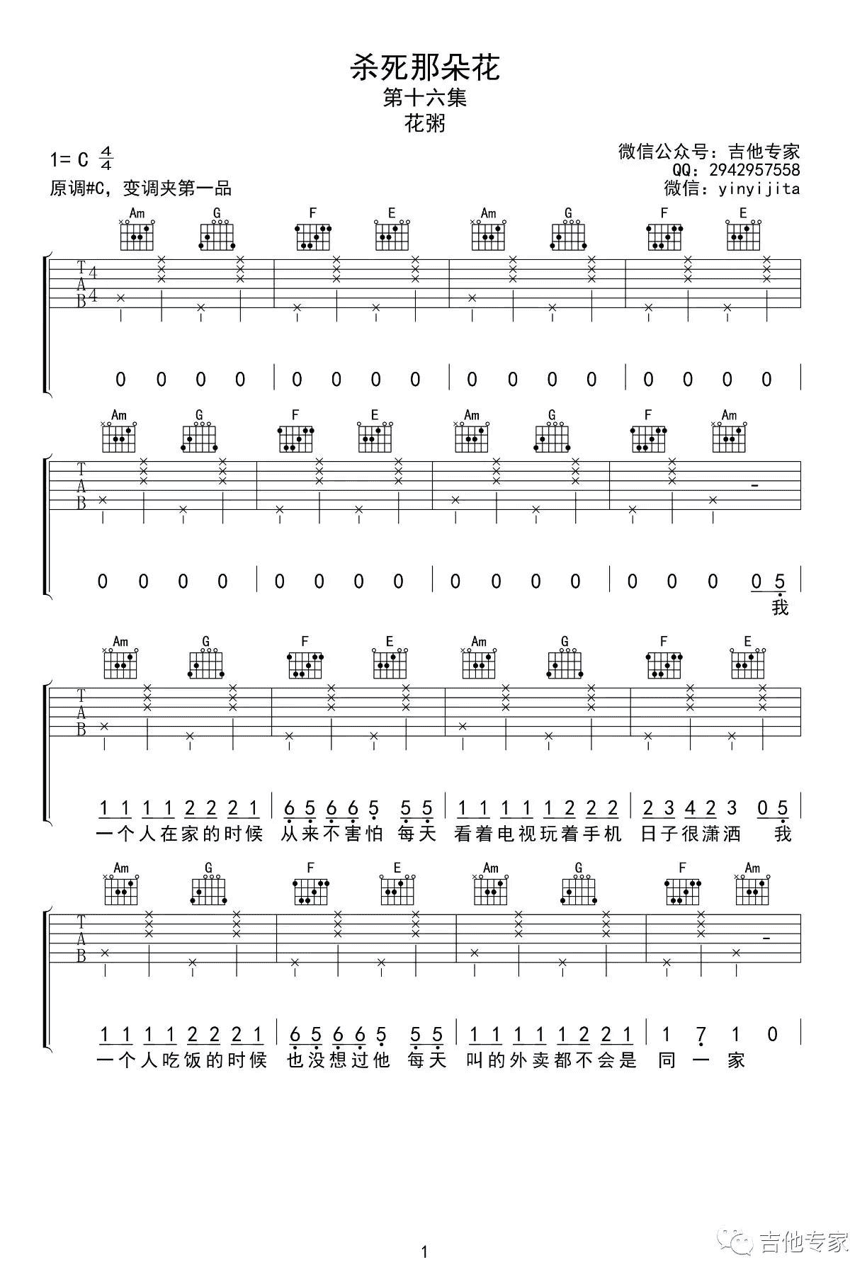 杀死那朵花吉他谱 花粥 C调弹唱六线谱 高清版 时间:2017-05-13 来源:音艺吉他 点击:次 花粥《杀死那朵花》吉他谱,C调弹唱谱,高清图片谱,杀死那朵花六线谱,变调夹夹一品。花粥的一首民谣歌曲,清新的旋律,治愈的歌声,简单的和弦,易唱网上传推荐。