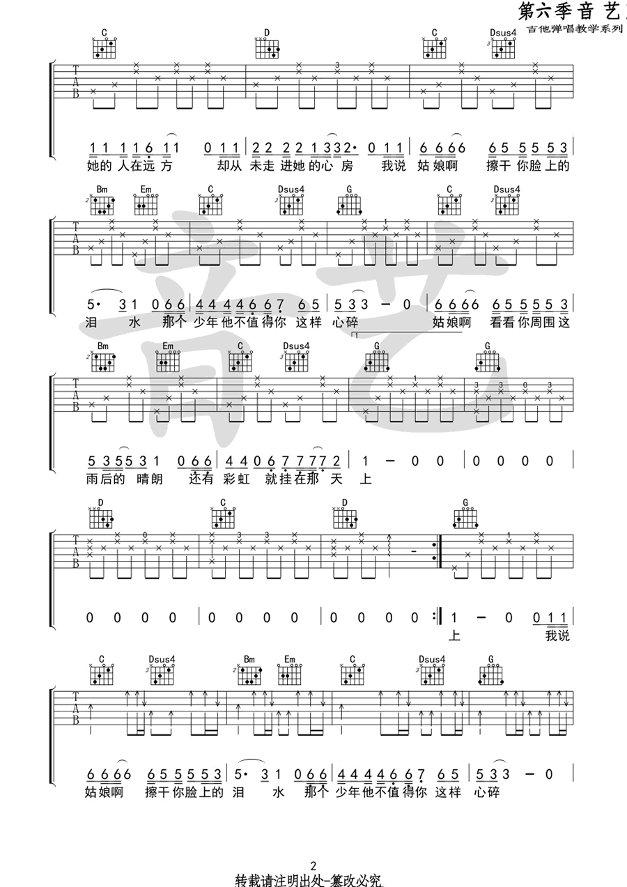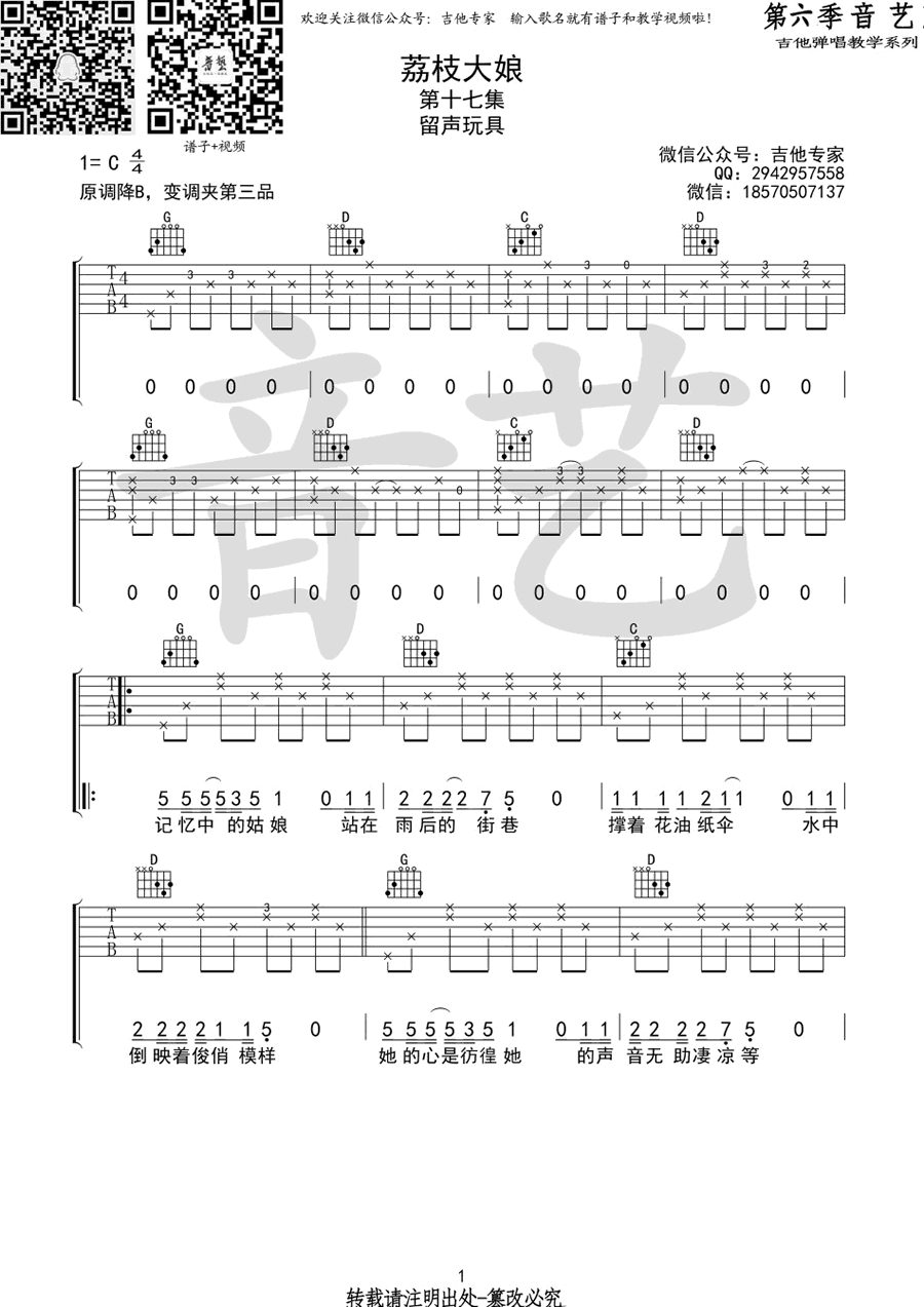 荔枝大娘吉他谱 C调 留声玩具 弹唱谱六线谱 时间:2017-05-16 来源:音艺吉他 点击:次 留声玩具《荔枝大娘》吉他谱,原调降B调,变调夹夹四品,选用C调指法。荔枝大娘吉他弹唱谱,三张图片六线谱。音艺吉他编配,易唱网整理上传。