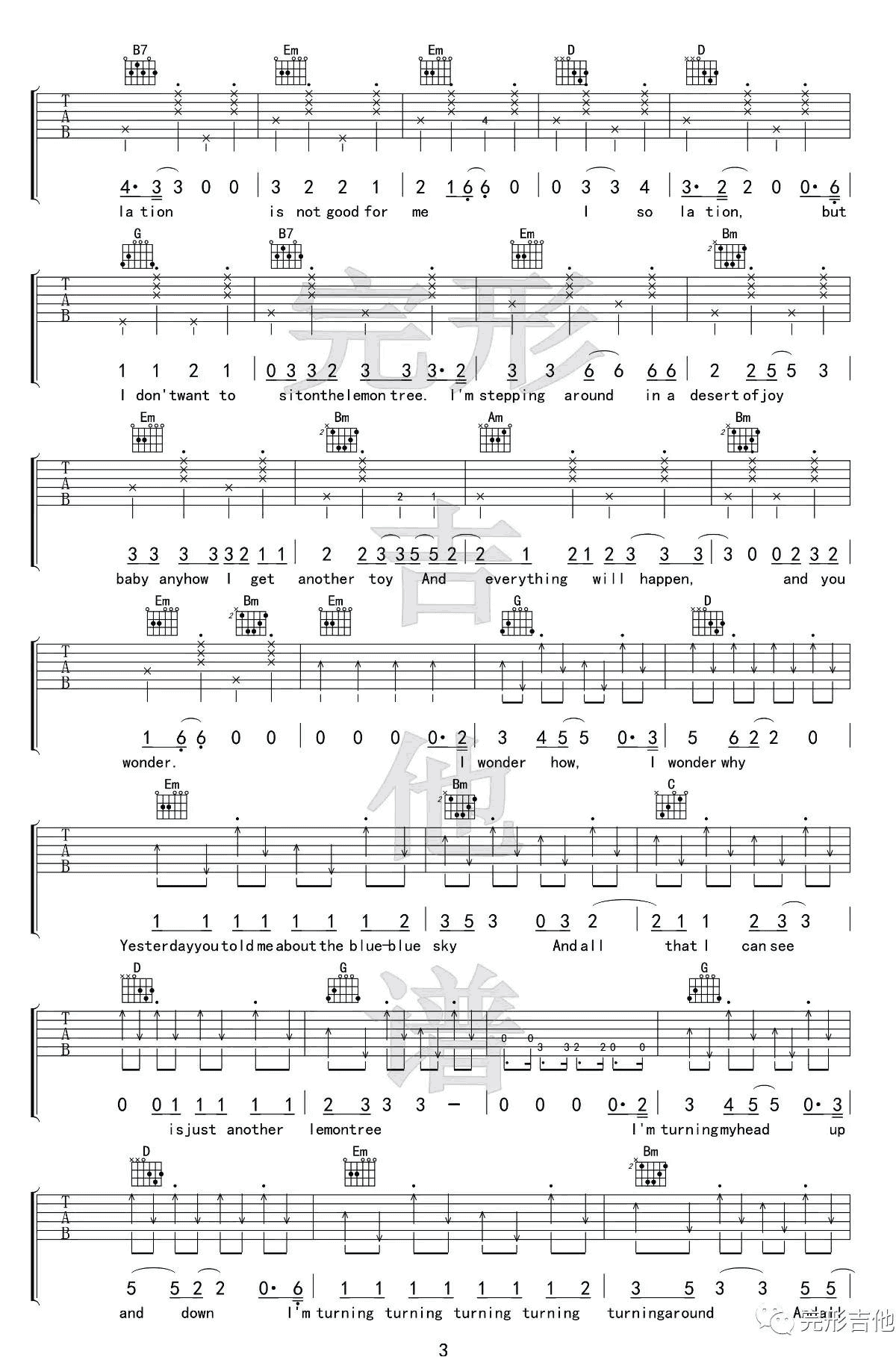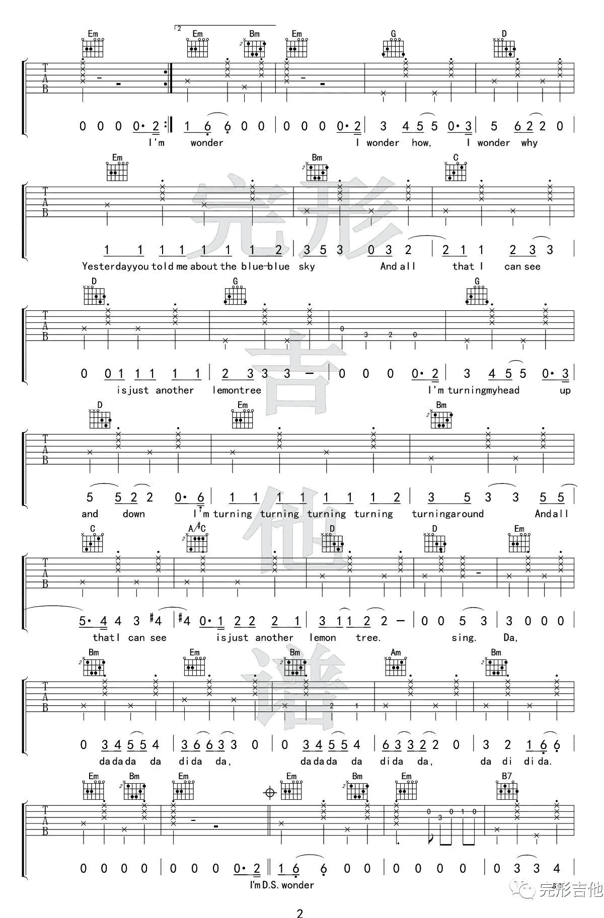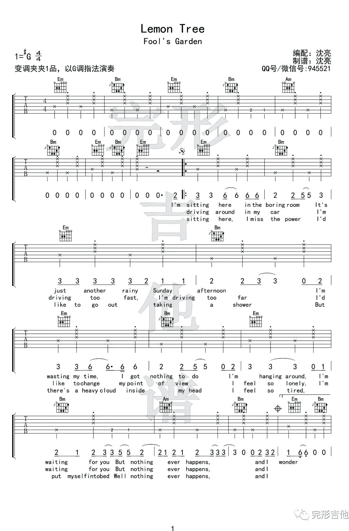 Lemon Tree吉他谱 柠檬树六线谱 吉他弹唱教学视频 时间:2017-05-31 来源:完形吉他 点击:次 柠檬树吉他谱,fool's garden愚人花园演唱的一首经典英文民谣歌曲,《Lemon Tree》吉他谱,G调指法,六线谱高清版,完整版共四张图片谱,沈亮编配制谱,随谱附上完形吉他带来的《柠檬树》吉他弹唱教学随谱,易唱网上传分享。