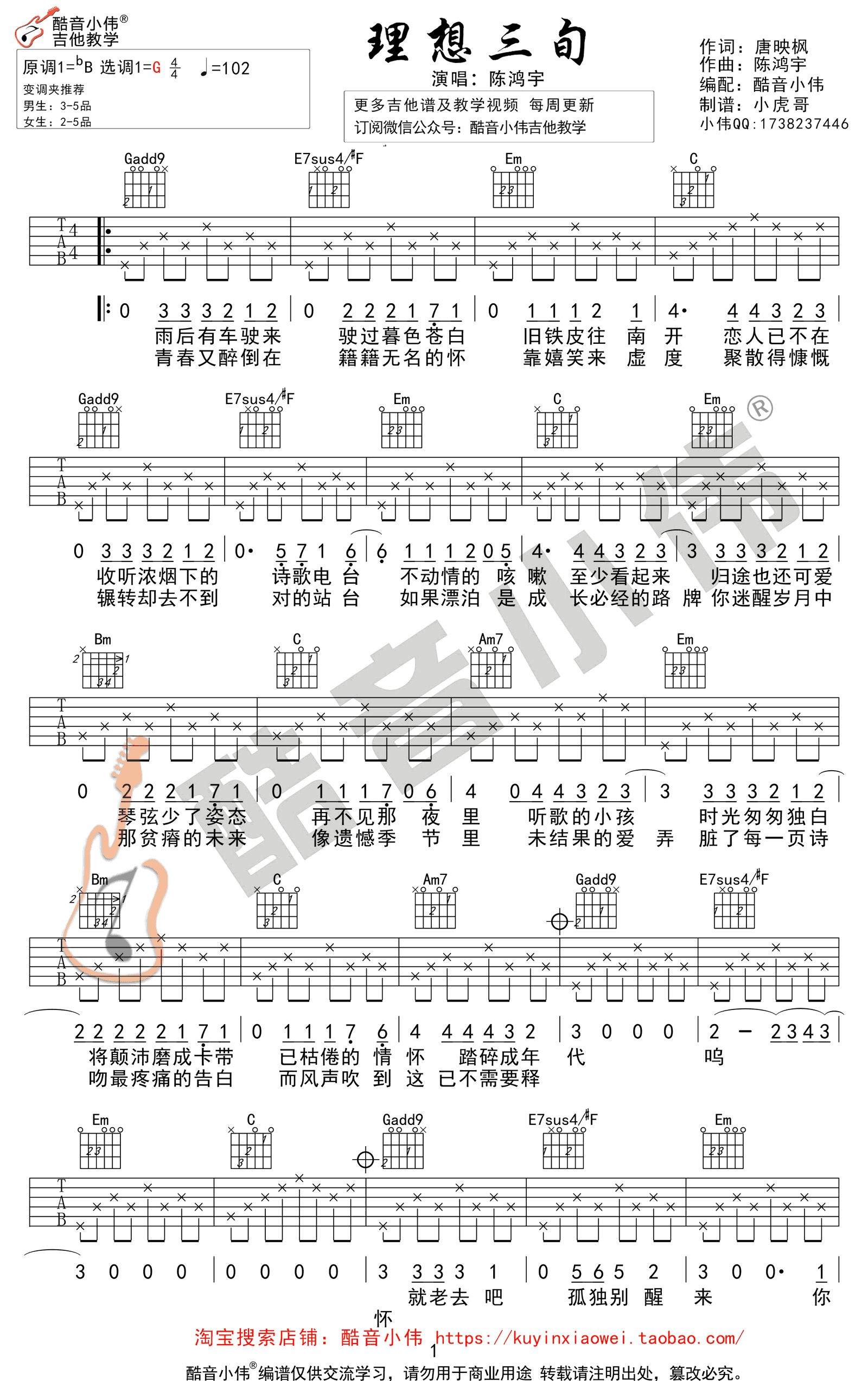 理想三旬吉他谱 陈鸿宇 G调六线谱 弹唱教学视频 时间:2017-06-02 来源:酷音小伟 点击:次 陈鸿宇 理想三旬吉他谱,原调降B,选调C,变调夹男生3-5品,女生2-5品。理想三旬吉他弹唱谱,高清图片六线谱。感谢酷音小伟编配曲谱,并为琴友们带来《理想三旬》吉他弹唱教学视频。