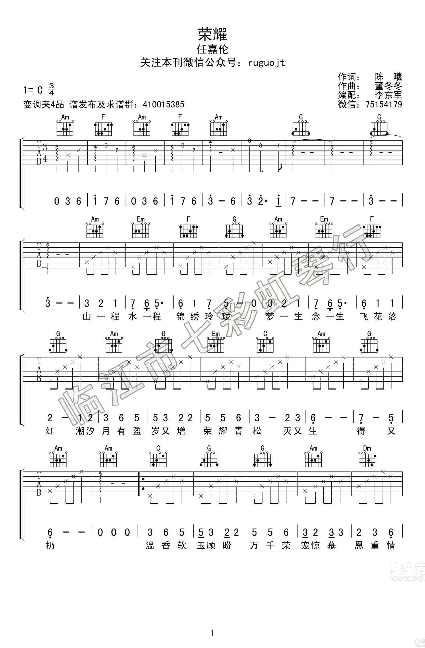 任嘉伦《荣耀》吉他谱 电视剧《大唐荣耀》主题曲 弹唱谱 时间:2017-06-04 来源:东军吉他 点击:次 荣耀吉他谱,任嘉伦演唱,C调指法,变调夹夹四品。电视剧《大唐荣耀》主题曲,荣耀吉他弹唱谱,高清图片谱,六线谱编配东军吉他,易唱网上传。