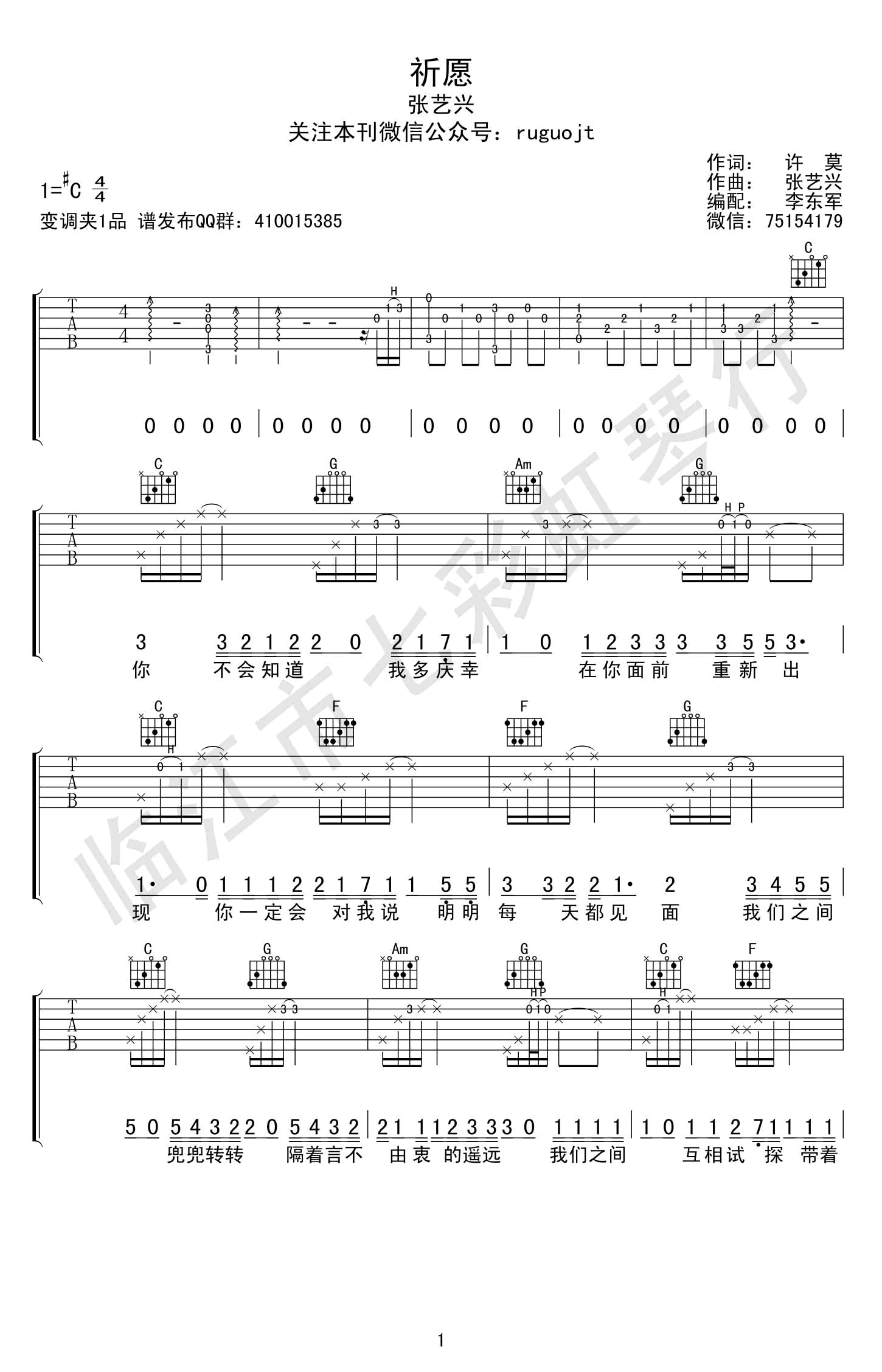 张艺兴《祈愿》吉他谱 C调高清弹唱谱 高清版 时间:2017-06-05 来源:东军吉他 点击:次 张艺兴祈愿吉他谱,原调#C调,变调夹夹一品,祈愿吉他弹唱谱,六线谱编配,高清图片谱三张谱例。电视剧《求婚大作战》插曲《祈愿》,略带伤感又悠扬婉转的曲调中,将青春里的心事,用音乐的语言娓娓道来,让人过耳不忘。李东军编配,易唱网上传。
