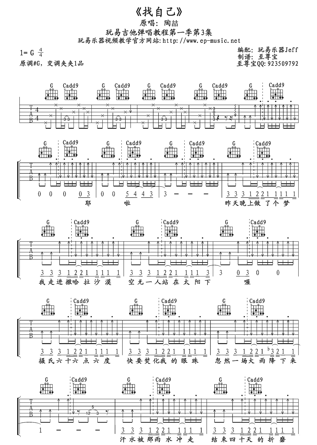 找自己吉他谱 陶喆 G调弹唱谱 高清图片谱 时间:2017-05-28 来源:玩易吉他 点击:次 找自己吉他谱,陶喆演唱的一首歌曲,找自己六线谱,三张高清图片谱。G调编配,CAPO夹一品,JEFF编配,易唱网上传。陶喆的《找自己》,通过轻快的音乐旋律找回充满干劲的自己吧!