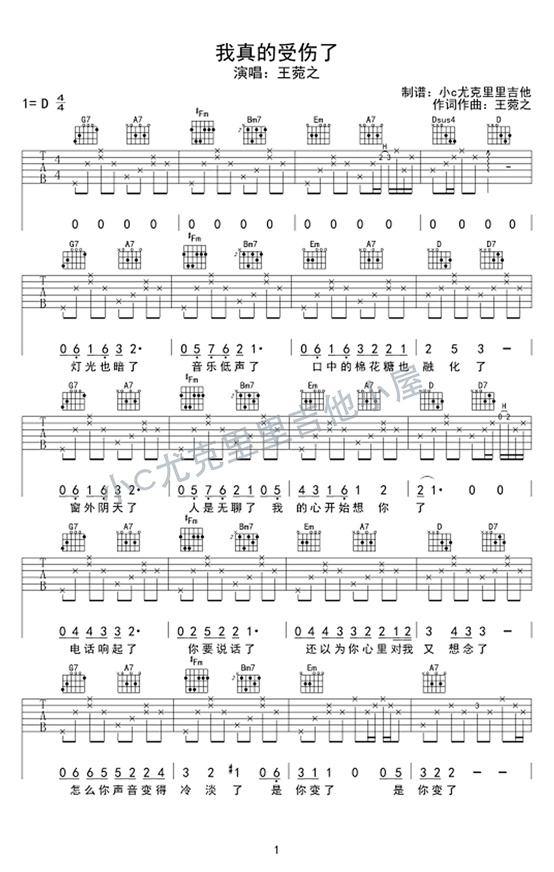 我真的受伤了吉他谱 王菀之 D调女生版 弹唱六线谱 时间:2017-06-06 来源:小C尤克里里 点击:次 我真的受伤了吉他谱,D版原调女生版,香港音乐才女王菀之演唱的《我真的受伤了》吉他弹唱谱,六线谱编配,两张图片谱。易唱网推荐收藏。幻像似的爱情,埋藏我心深处,每个冷冰的晚上,那温暖都在我心。 《我真的受伤了》是张学友很经典的代表作。