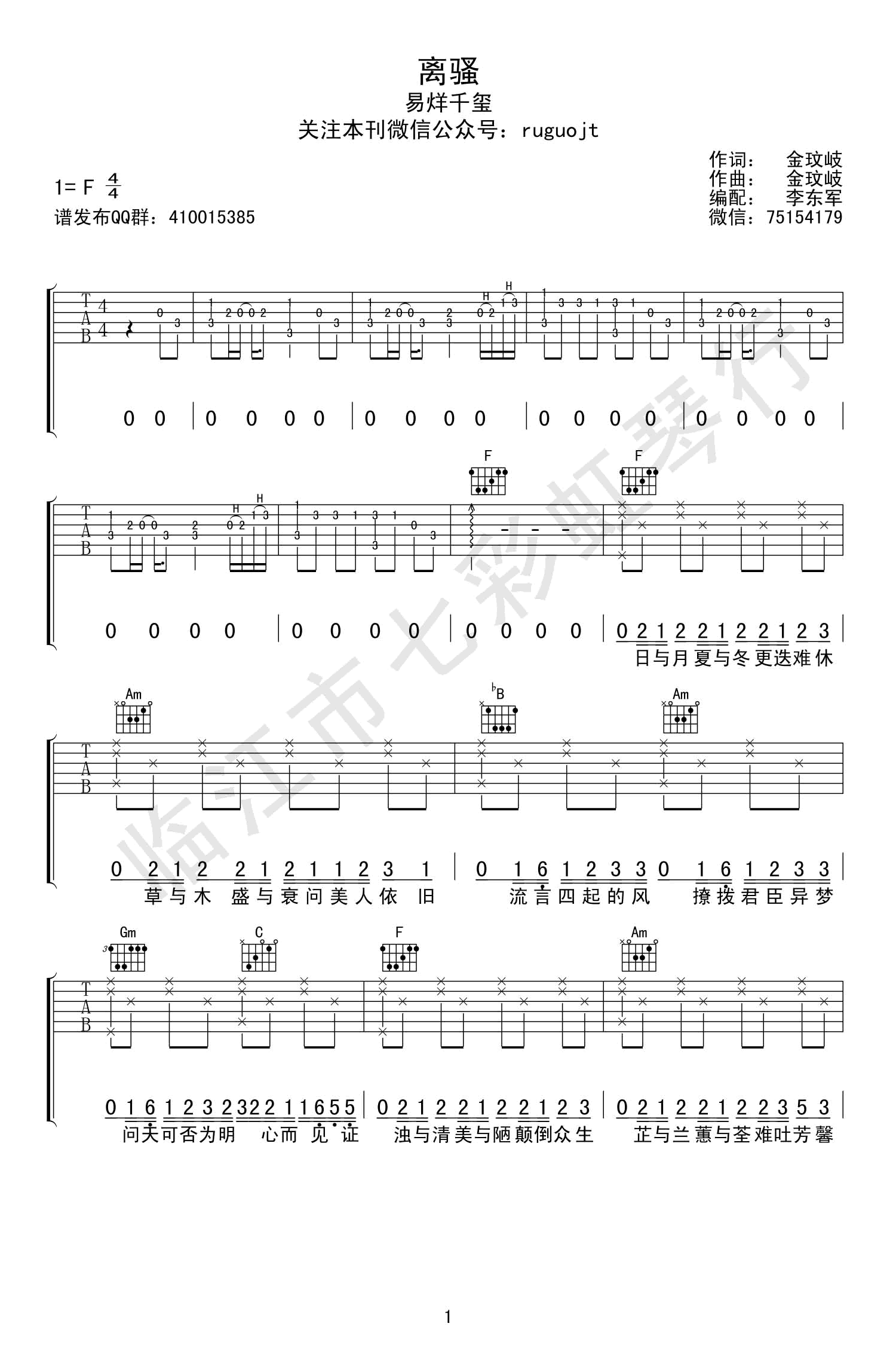离骚吉他谱 易烊千玺 《思美人》电视剧片尾曲 弹唱谱 时间:2017-06-08 来源:东军吉他 点击:次 离骚吉他谱,TFBoys成员易烊千玺演唱,电视剧《思美人》演唱的片尾曲,离骚吉他弹唱谱,F调指法,六线谱高清版,共三张图片谱。临江七彩虹琴行分享,易唱网上传。