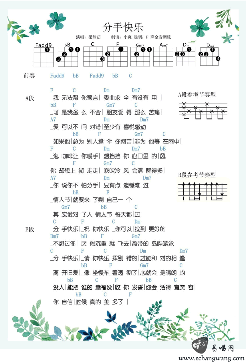 分手快乐ukulele谱 梁静茹 尤克里里谱 图片谱 时间:2017-06-12 来源:心忆 点击:次 梁静茹分手快乐尤克里里谱,选调F,降全音调弦,分手快乐尤克里里谱,乌克丽丽编配弹唱谱,和弦节奏型参考图片标注。感谢心忆小爽制谱,易唱网上传。