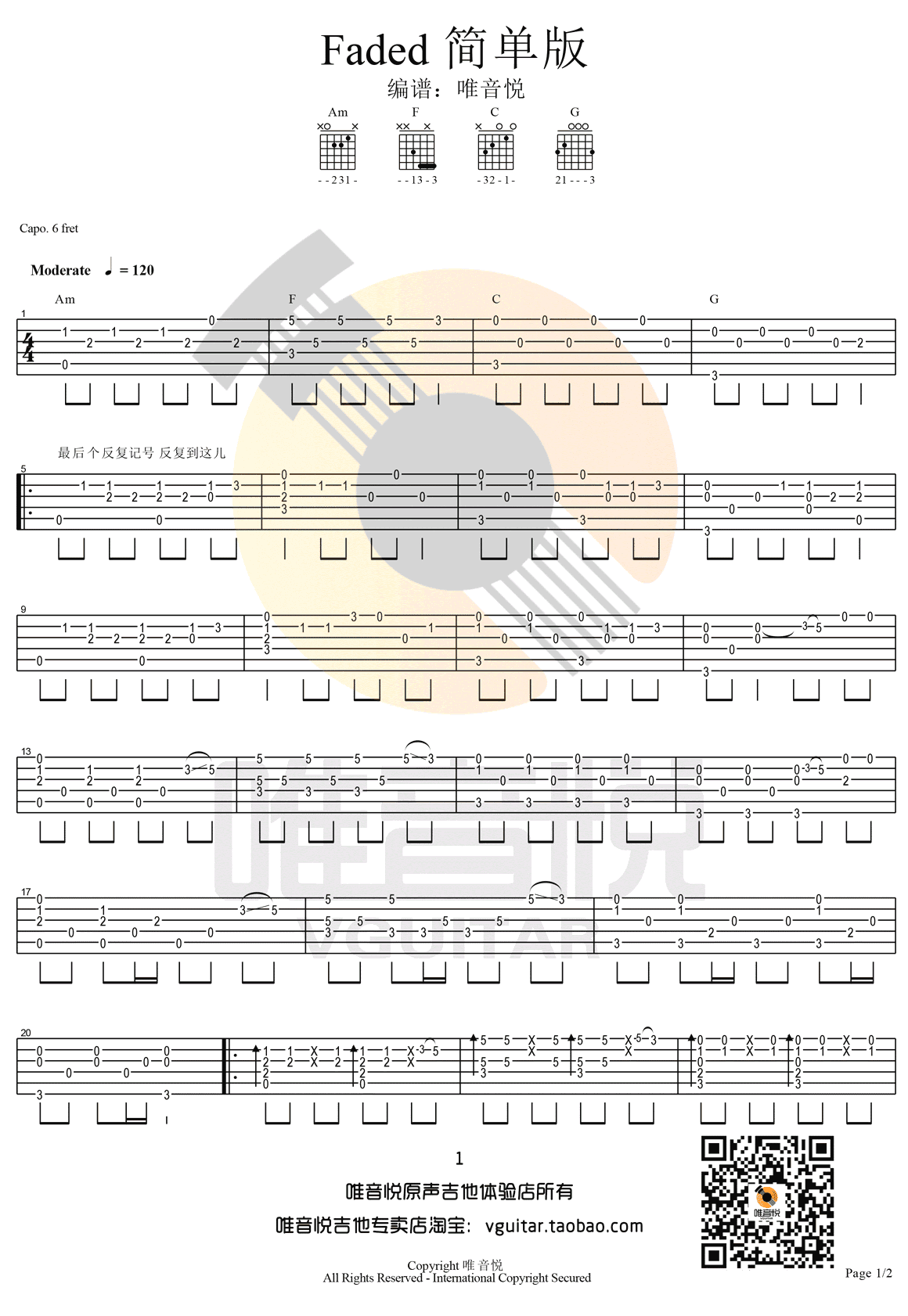 faded指弹吉他谱 简单版 Alan walker faded吉他独奏谱 时间:2017-06-12 来源:唯音悦 点击:次 faded指弹吉他谱,简单版编配,capo夹六品,faded吉他独奏谱,高清图片谱,唯音悦出品,易唱网上传推荐。