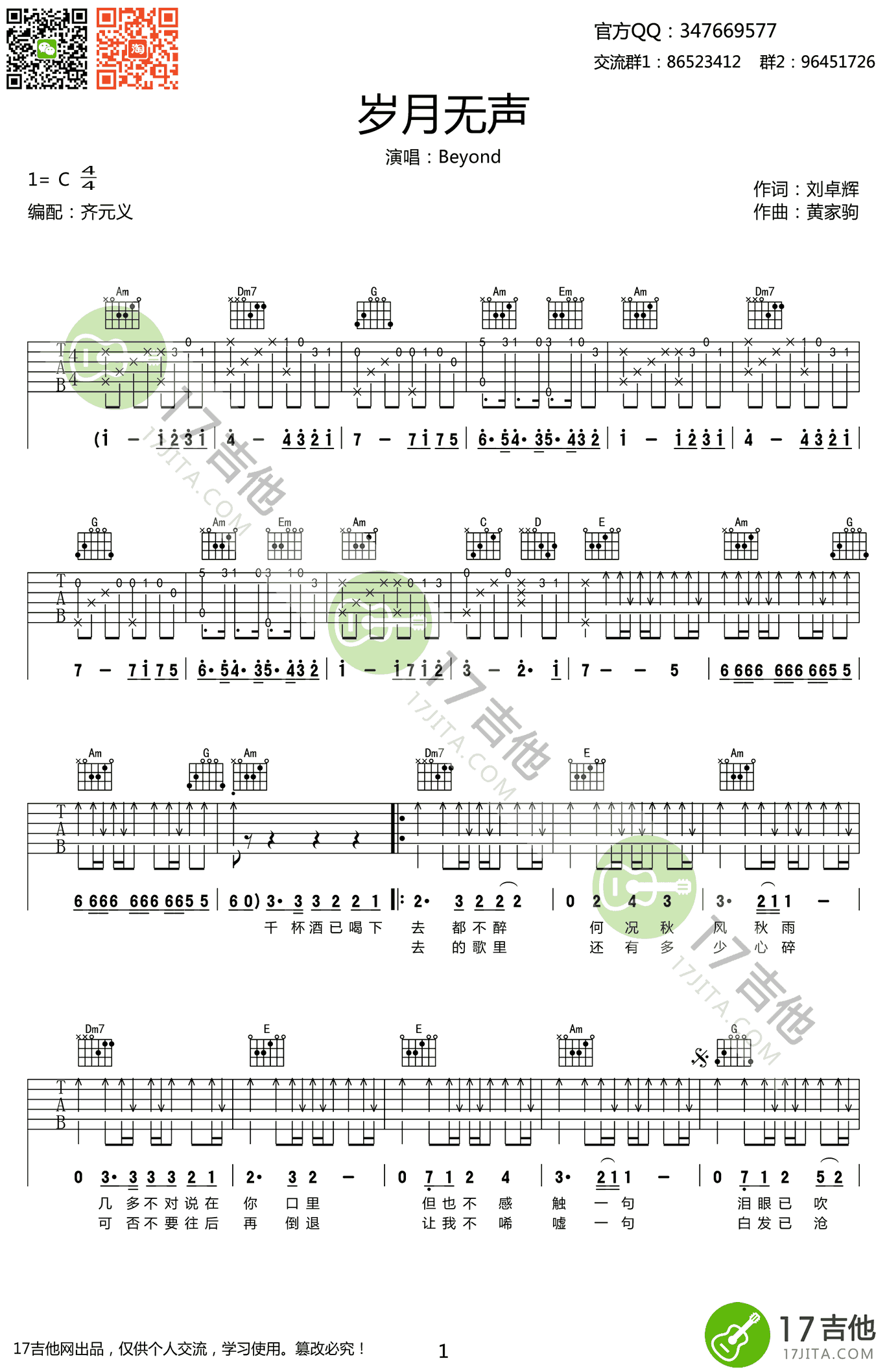 岁月无声吉他谱 Beyond C调高清版 弹唱六线谱 时间:2017-06-13 来源:齐元义 点击:次 岁月无声吉他谱,香港摇滚乐队Beyond的一首摇滚音乐作品,岁月无声六线谱,C调指法,弹唱谱高清版本,两张图片谱。齐元义编配,易唱网推荐收藏。这首歌表达了对沧桑,对世事变迁,时间无情的感慨,但更加表达了永远都不会太迟,总有胜利的一天的无所畏惧的男儿情怀。这是BEYOND重金属风格的代表作之一,前奏就用以典型的重金属乐器给人以强烈的节奏感。黄家驹的声音沙哑,沉厚,极富感染力,是一代经典之作。