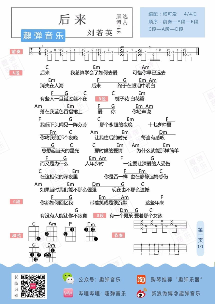 后来尤克里里谱_刘若英《后来》ukulele谱_C调 时间:2017-06-13 来源:趣弹音乐 点击:次 《后来》ukulele谱,刘若英演唱的一首经典情歌,后来尤克里里谱,带前奏弹唱谱,原调bE,选调C,杨可爱老师编配,和弦节奏型标注见图片谱。易唱网上传分享。