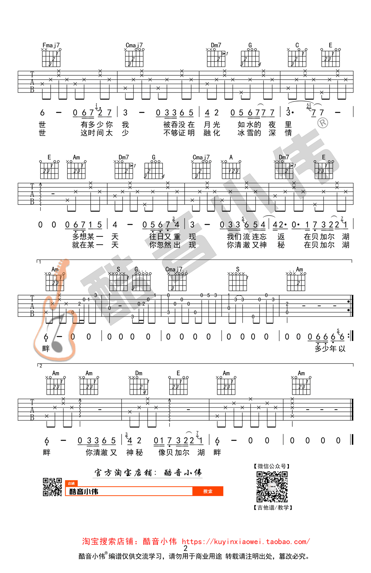 贝加尔湖畔吉他谱 C调简单版 高清弹唱六线谱 时间:2017-06-14 来源:酷音小伟 点击:次 贝加尔湖畔吉他谱,李健演唱,C调简单版,男生建议使用变调夹,2-5品位置。贝加尔湖畔六线谱,高清弹唱图片谱,酷音出品,易唱网吉他谱推荐收藏。行云流水的旋律、诗意般的歌词、李健深情的演唱,汇聚成这首如诗如画的歌曲。