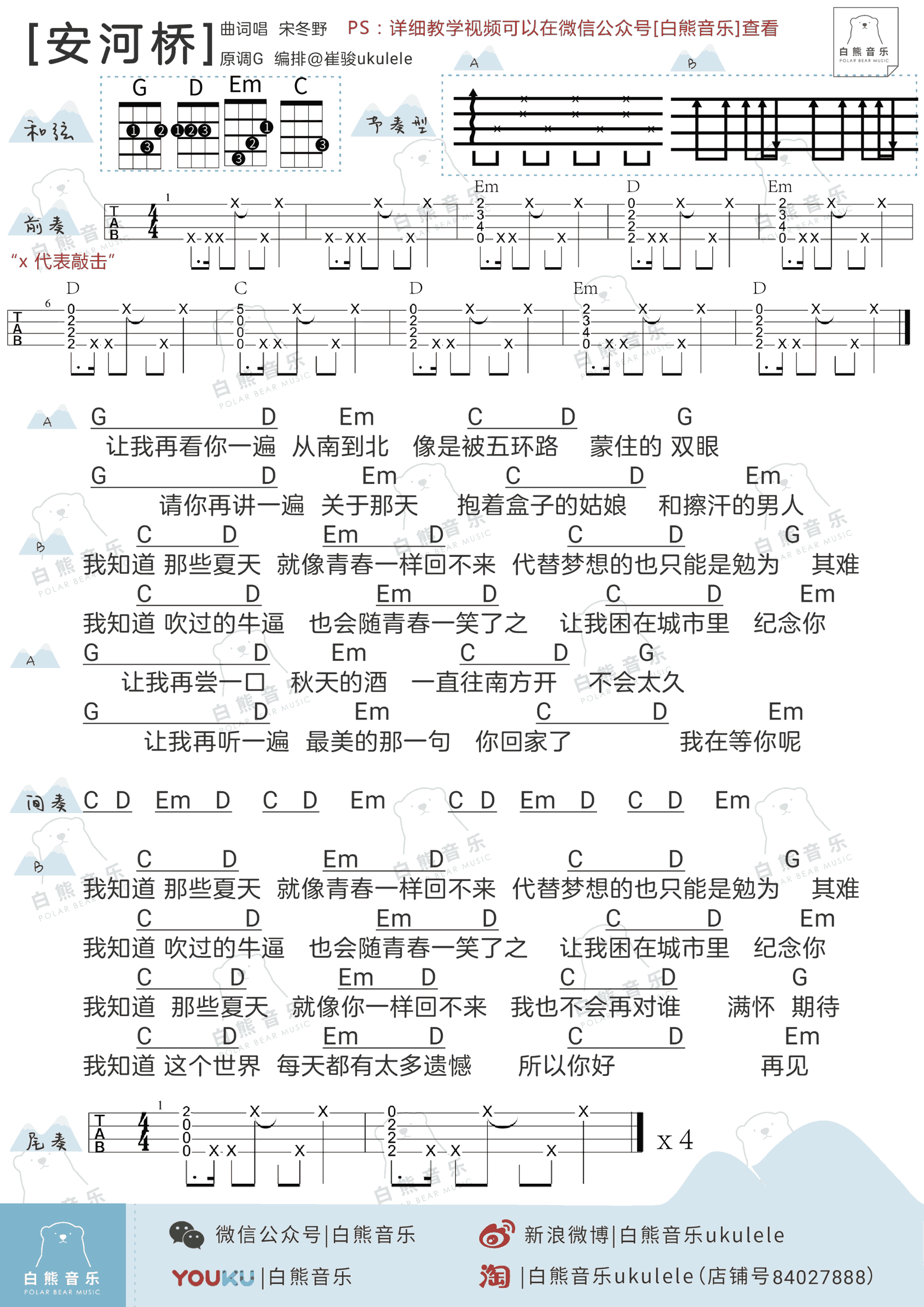 安和桥尤克里里谱 宋冬野/薛之谦 ukulele弹唱教学视频 时间:2017-06-15 来源:白熊音乐 点击:次 《安和桥》ukulele谱,高清图片谱,宋冬野原唱,安和桥尤克里里谱。薛之谦一曲《安和桥》唱出十年之约,只为了完成10年前的一句承诺,他要为她弹吉他,"是否说过要同去北方看雪景,一晃如今已经是十年前的约定,我答应过会在演唱会上为你弹琴,就让我的歌陪着你远行,一路让你听" ,详细教学视频: