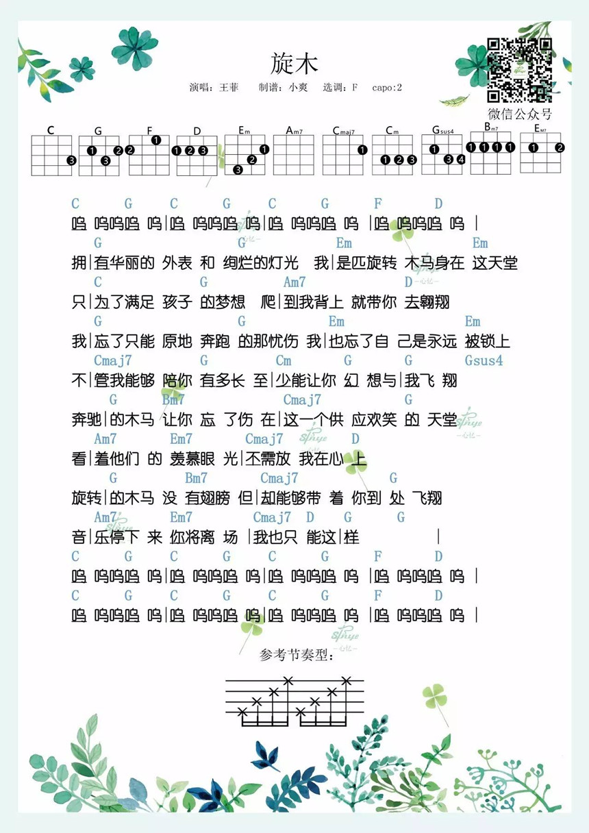 旋木ukulele谱 王菲《旋木》尤克里里谱 时间:2017-06-16 来源:心忆尤克里里 点击:次 王菲旋木ukulele谱,变调夹夹二品,袁惟仁的代表作品,旋木尤克里里谱,和弦编配,参考节奏型参见图片谱。感谢小爽制谱,易唱网上传。