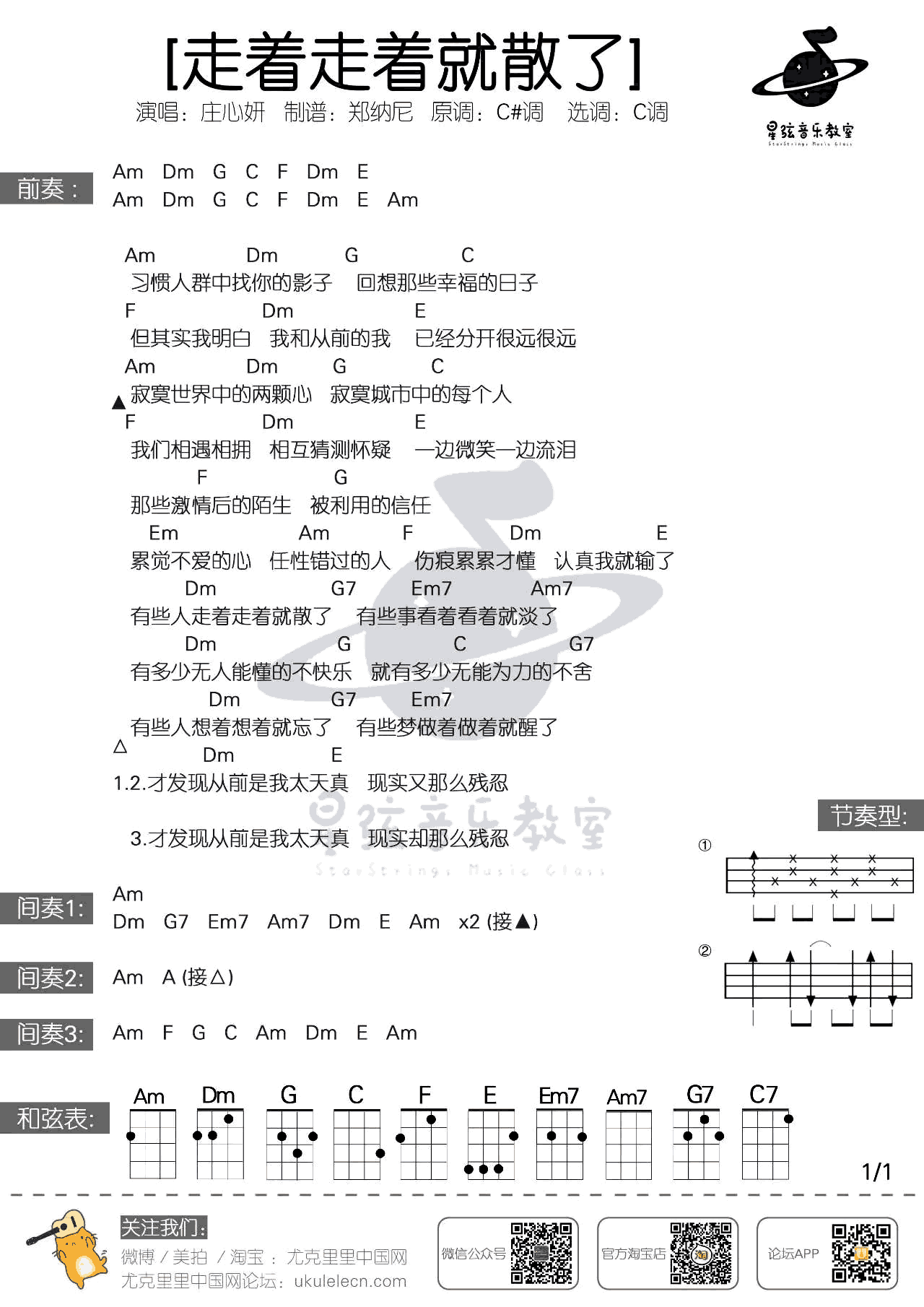 走着走着就散了ukulele谱 庄心妍 尤克里里谱 C调弹唱 时间:2017-06-17 来源:星弦音乐 点击:次 庄心妍 走着走着就散了尤克里里谱,C调指法,和弦节奏型琴友们参考图片谱标注。走着走着就散了ukulele谱,一首网络红歌,伤感的旋律打动每一个为爱散场的红尘男女。感谢星弦音乐教室,易唱网发布上传。