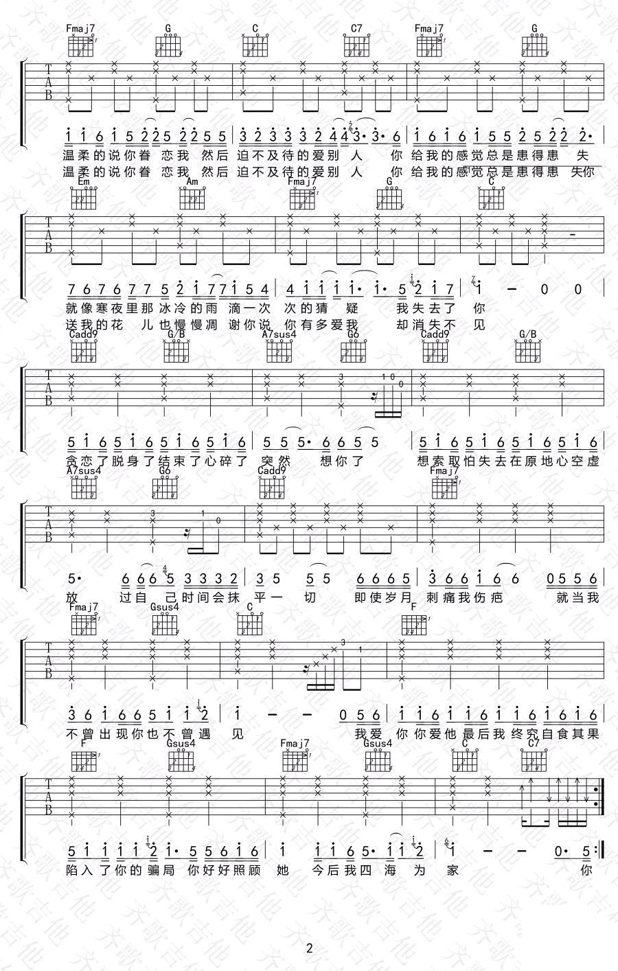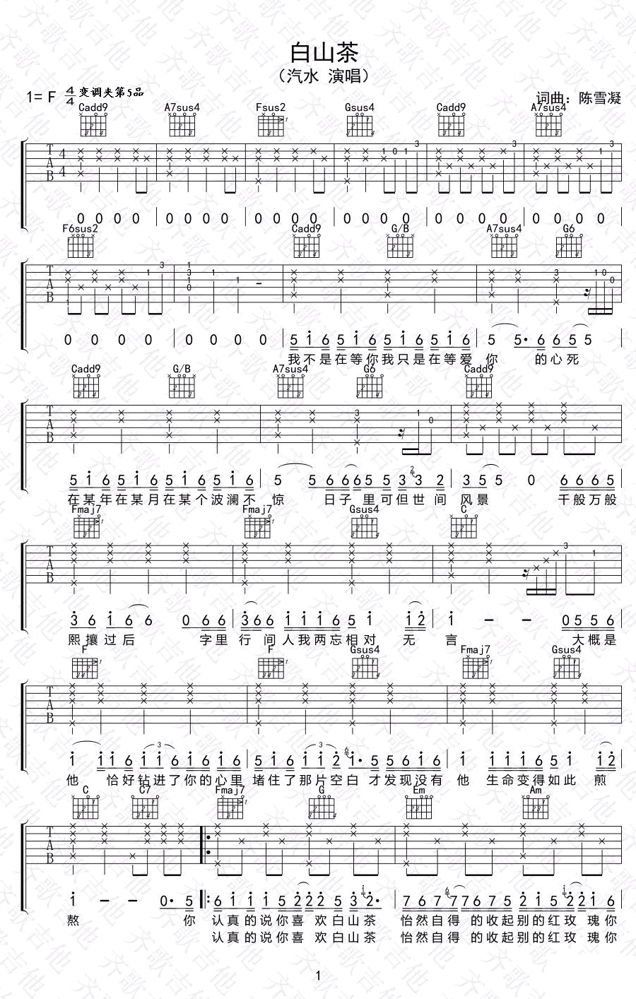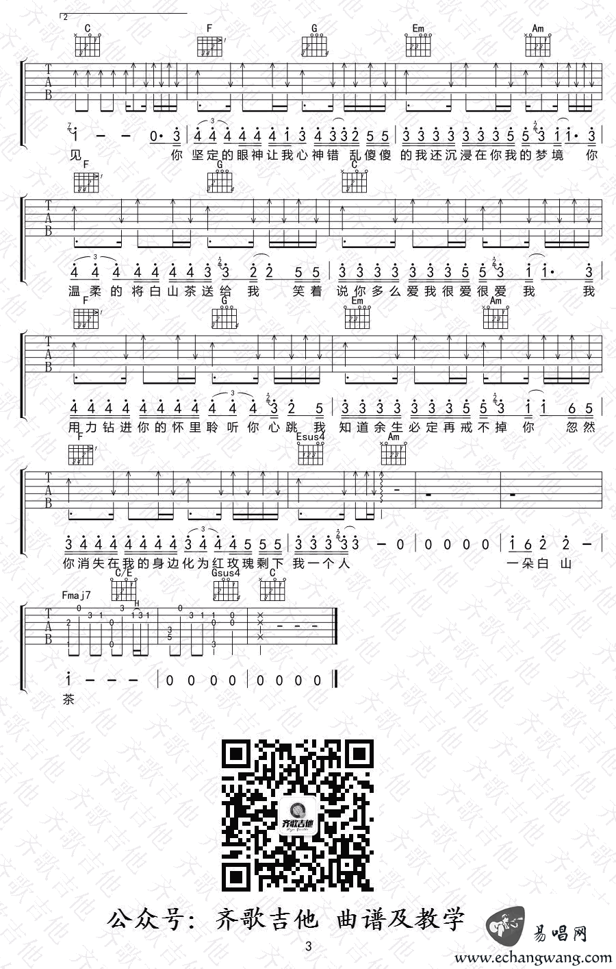 ca88-手机APP下载-易唱网echangwang.com 时间:2017-06-18 来源:齐歌吉他 点击:次 陈雪凝《白山茶》吉他谱,原调F,变调夹夹五品,白山茶吉他弹唱谱,网络女主播汽水妹陈雪凝的一首好听的原创歌曲,“我不是在等你,只是在等爱你的那颗心死。”这是一首朴素真实但充满故事的歌,因为它总是能让你想起你心中的那个人。或许不知不觉中我们就变成了那朵白山茶,或者那个选择红玫瑰的人。