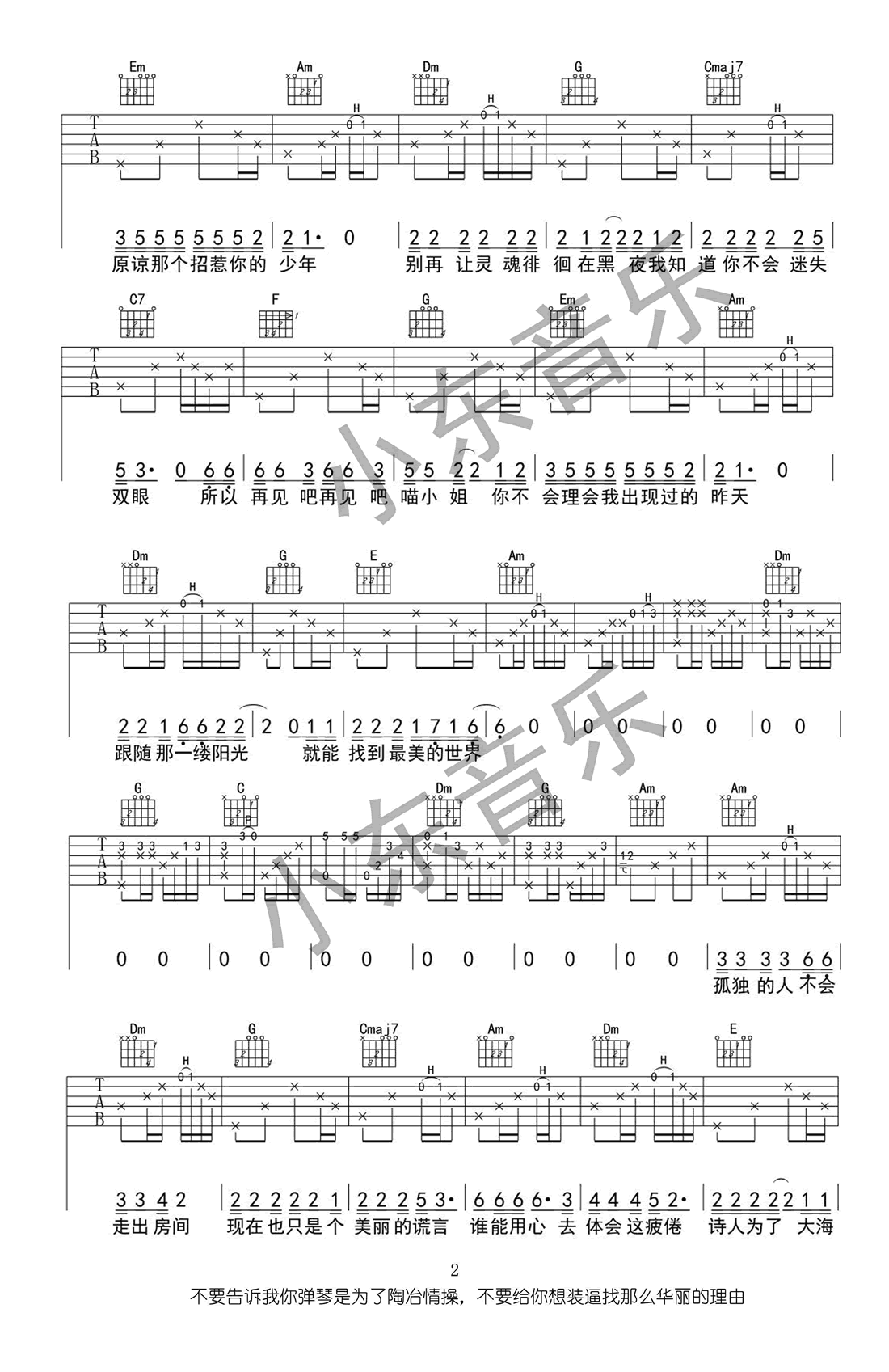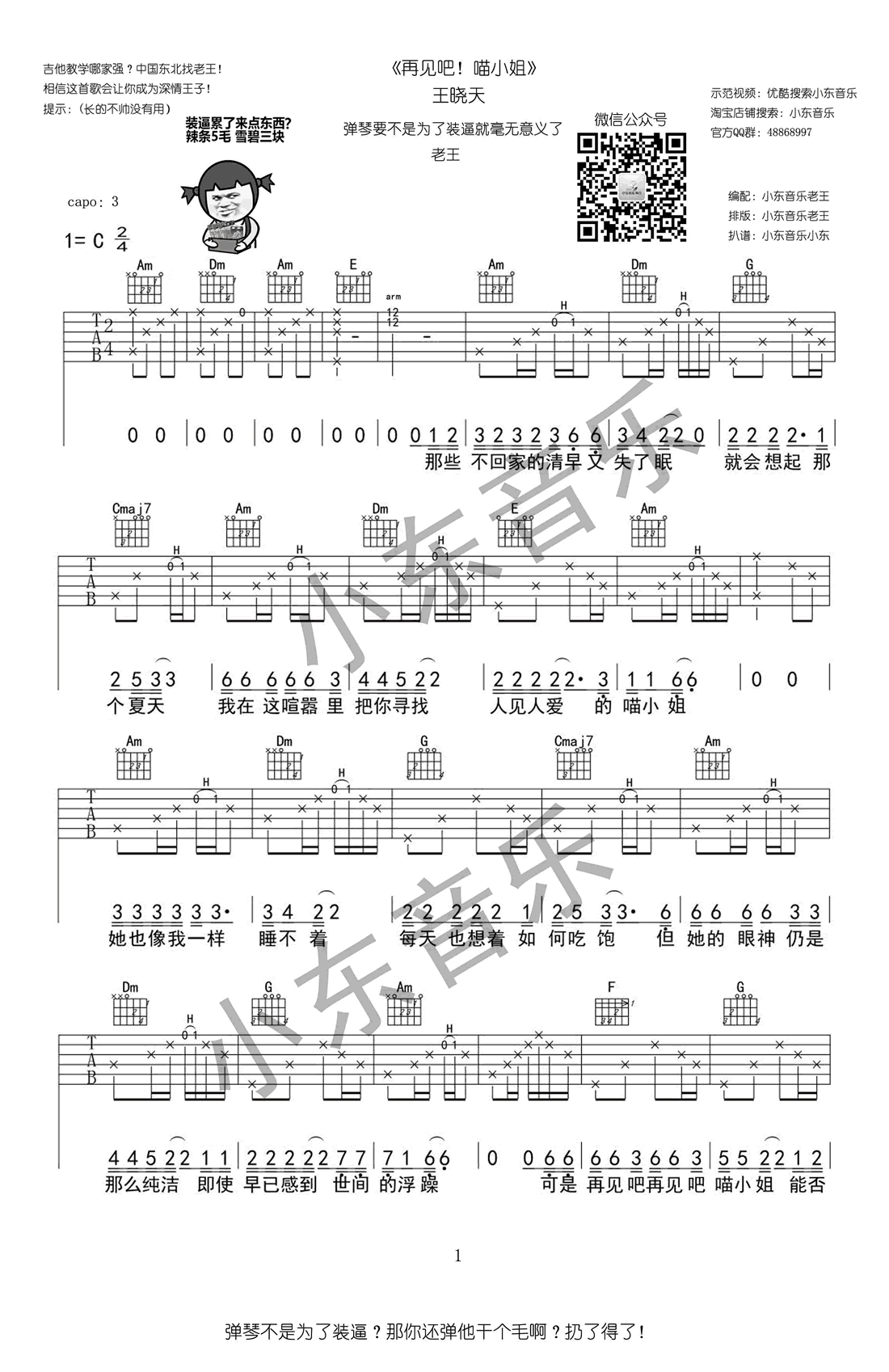 《再见吧,喵小姐》吉他谱 王晓天 C调六线谱 高清弹唱谱 时间:2017-06-19 来源:小东音乐 点击:次 王晓天《再见吧喵小姐》吉他谱,C调指法,变调夹夹三品;王晓天在《中国好歌曲》节目演唱的一首好听的民谣创作歌曲,再见吧喵小姐六线谱,完整版四张高清图片谱,小东音乐出品,易唱网为琴友们上传分享。北漂男孩”王晓天抱着吉他的低吟浅唱充满了淡淡的忧伤,民谣式的曲调、动人的曲调呈现出极具画面感的场景,波澜不惊却又饱含深情。 共2页: 上一页12下一页