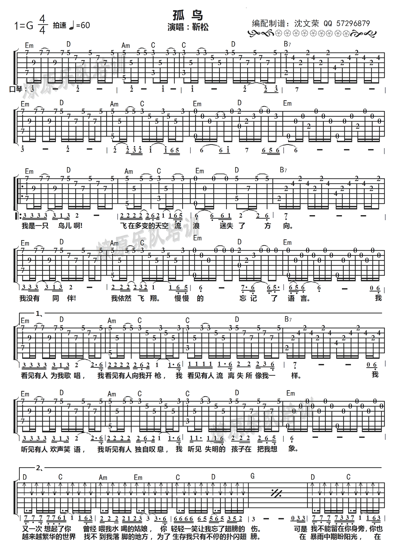 孤鸟吉他谱 靳松《孤鸟》六线谱 G调弹唱谱 时间:2017-06-20 来源:沈文荣 点击:次 靳松《孤鸟》吉他谱,G调弹唱谱,高清图片谱。孤鸟六线谱,靳松词曲演唱的一首民谣歌曲。 “你有你的万家灯火 我有我的漫漫天涯”,歌词平淡,却引起思绪万千。火车上、耳机中,靳松的《孤鸟》,从昏昏欲睡到满眼泪光。。。看着站台上背着行囊的人们心想,最近中毒太深了,爱这些流浪歌手和他们的民谣。