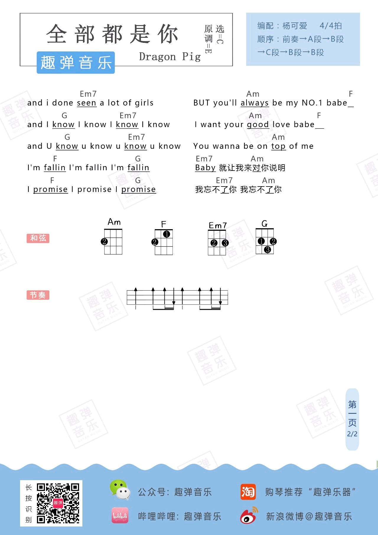 全部都是你ukulele谱 Dragon Pig 尤克里里谱 时间:2017-06-21 来源:趣弹音乐 点击:次 Dragon Pig《全部都是你》尤克里里谱,C调弹唱谱,全部都是你ukulele谱,杨可爱编配,带四线谱前奏图片谱。Dragonpig龙猪 的甜蜜表白神曲《全部都是你》小吉他弹唱,易唱网推荐分享。