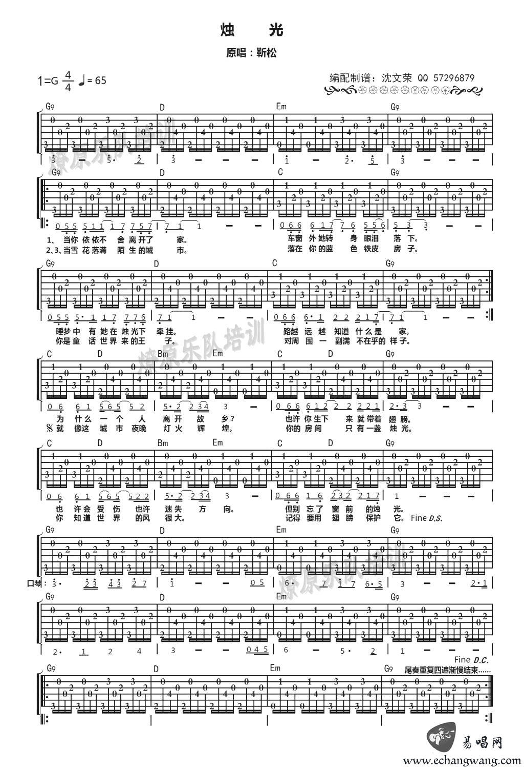 烛光吉他谱 靳松《烛光》六线谱 E调弹唱谱 时间:2017-06-22 来源:沈文荣 点击:次 靳松烛光吉他谱,G调弹唱谱,烛光六线谱,这是靳松填词谱曲并演唱的一首歌曲,收录在专辑《阿弥陀佛么么哒》中。沈文荣编配制谱,易唱网收藏推荐。靳松说《烛光》的灵感来自一位老人,每天在电话亭打电话,但电话竟然没插卡,一定是有一些无法诉说的思念。这多像小说里的情节。艺术源于生活,歌曲源于细腻。