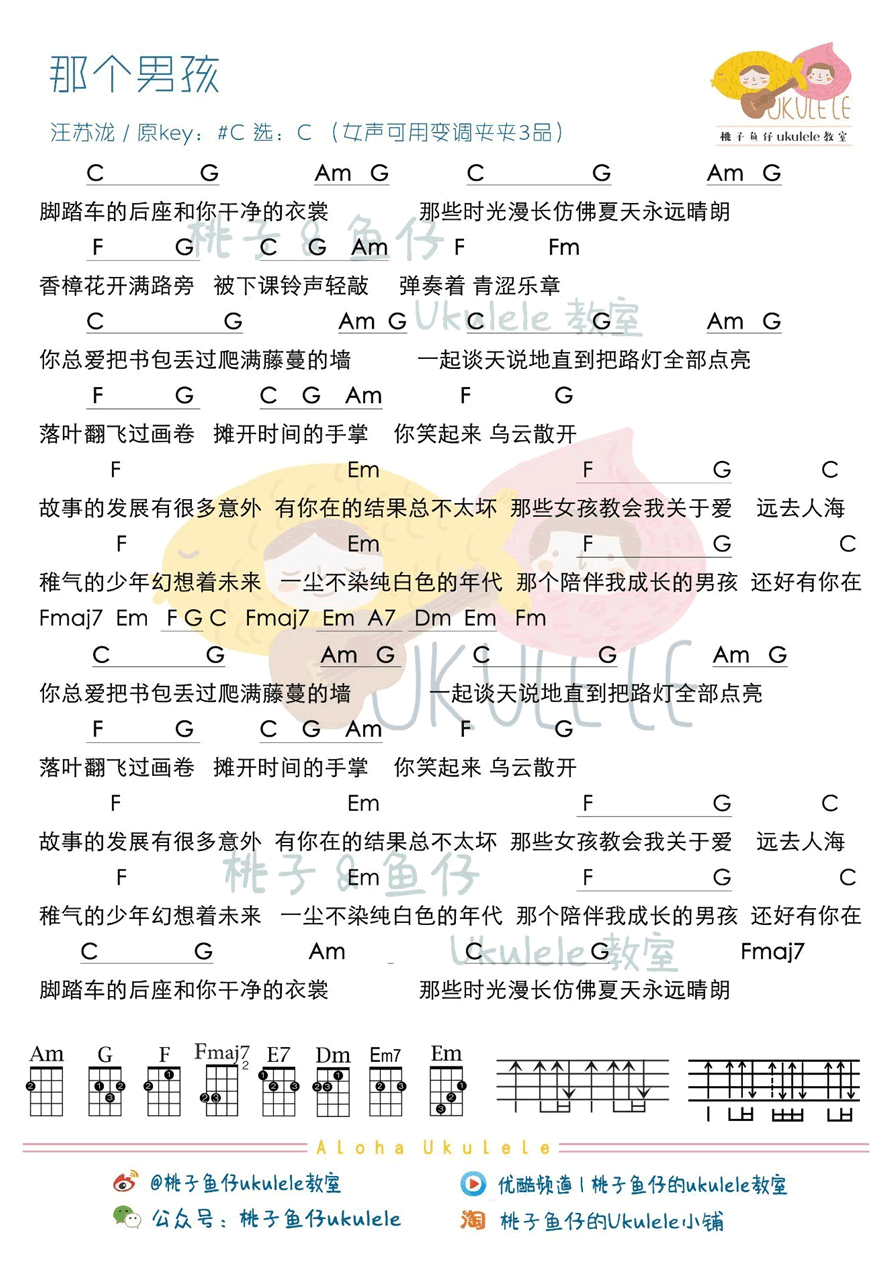 汪苏泷《那个男孩》尤克里里谱 夏至未至插曲 ukulele谱 时间:2017-06-27 来源:桃子鱼仔 点击:次 那个男孩ukulele谱,汪苏泷为校园青春剧《夏至未至》创作演唱的歌曲,那个男孩尤克里里谱,C调指法弹唱,女生可用变调夹夹三品。感谢桃子鱼仔编配曲谱,易唱网上传分享。作为剧中的友谊之曲,歌曲所展现出的是属于少年时代友谊的坚定与真挚。