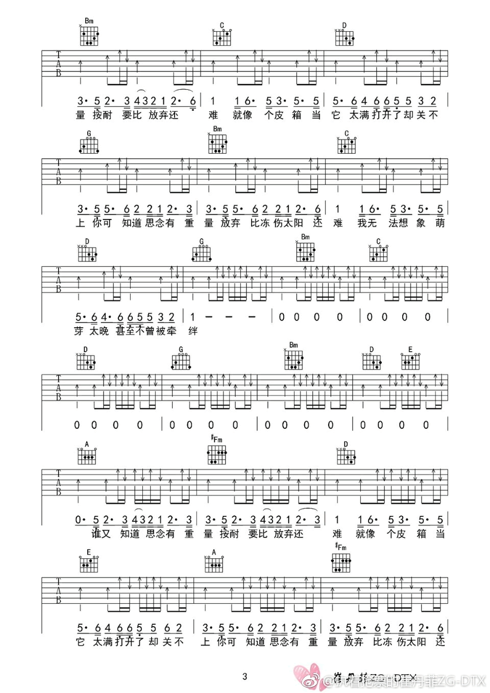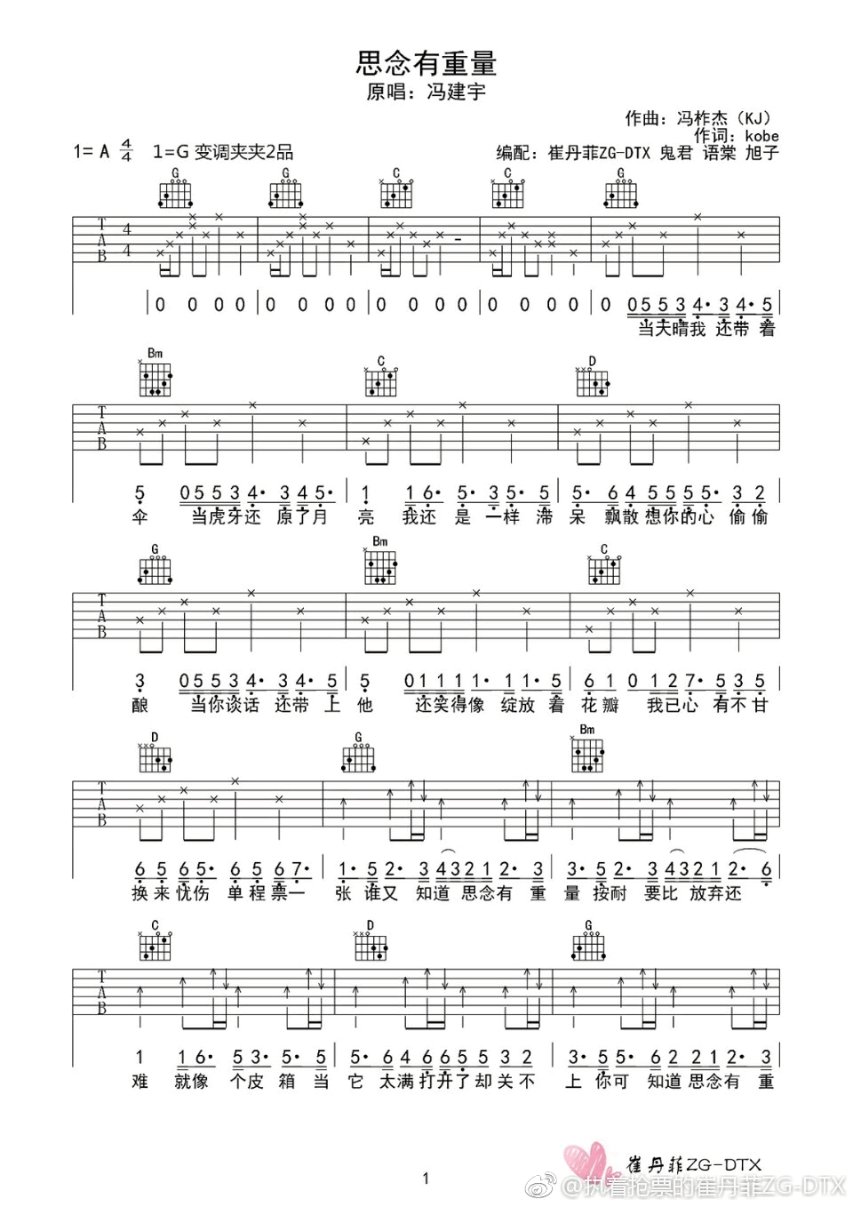 冯建宇《思念有重量》吉他谱 G调弹唱谱 六线谱 时间:2017-06-28 来源:网络 点击:次 思念有重量吉他谱,冯建宇演唱,原调A,选用G调指法,变调夹夹第二品。思念有重量六线谱,图片谱格式,感谢崔丹菲鬼君编配。易唱网上传。