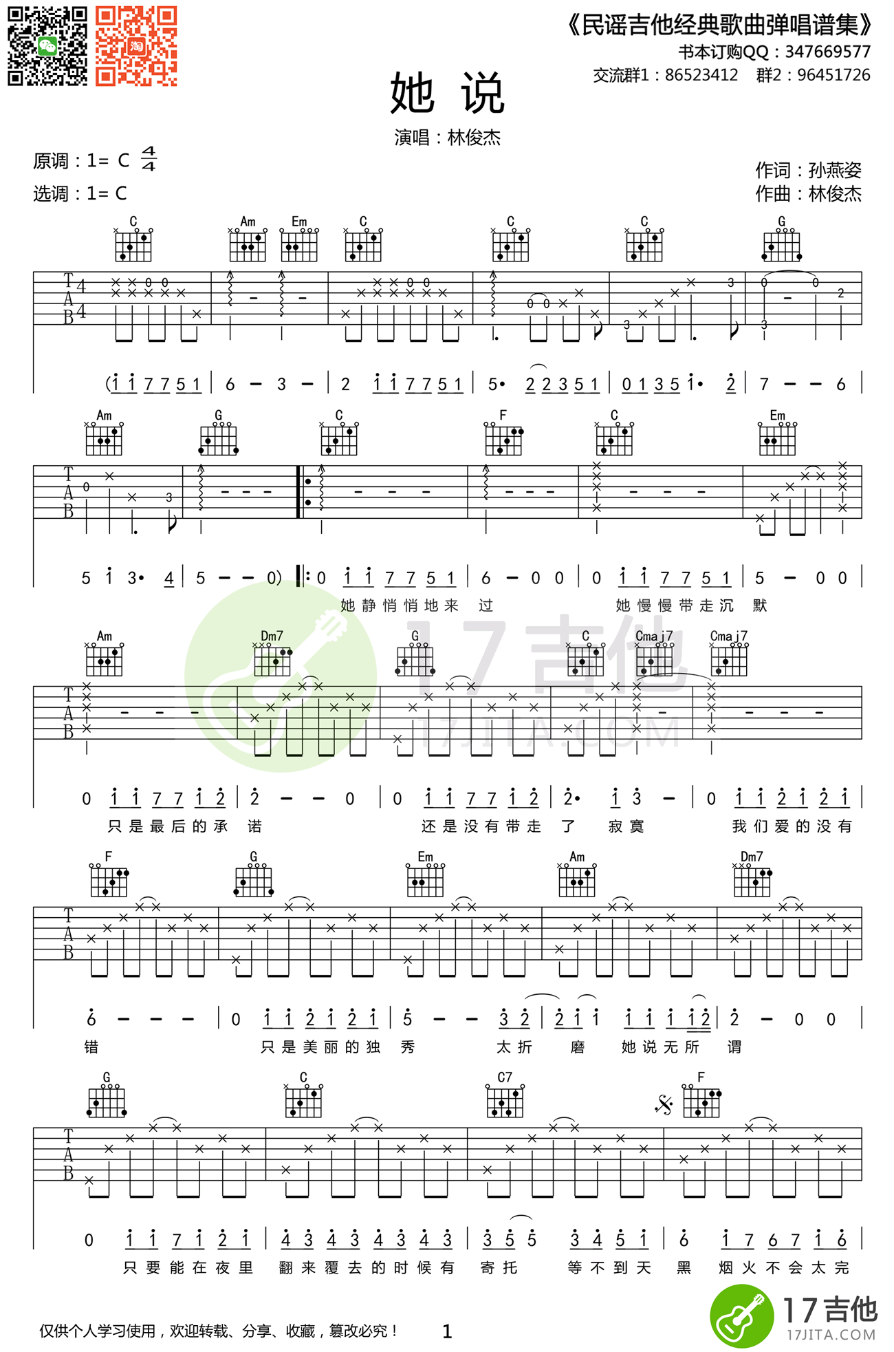 dafabet888唯一登录网站-手机APP下载-易唱网echangwang.com 时间:2017-06-30 来源:17吉他 点击:次 林俊杰《她说》吉他谱,C调弹唱谱,高清图片谱。她说六线谱,原版编配。林俊杰想创作一首“很有故事”的歌曲,因此他想到了孙燕姿。他认为孙燕姿外表坚强,但内心一定有一块很脆弱的地方,所以他打电话邀请孙燕姿作词,二人在电话中聊了歌曲的概念,林俊杰告诉孙燕姿希望歌曲名称定为《她说》。