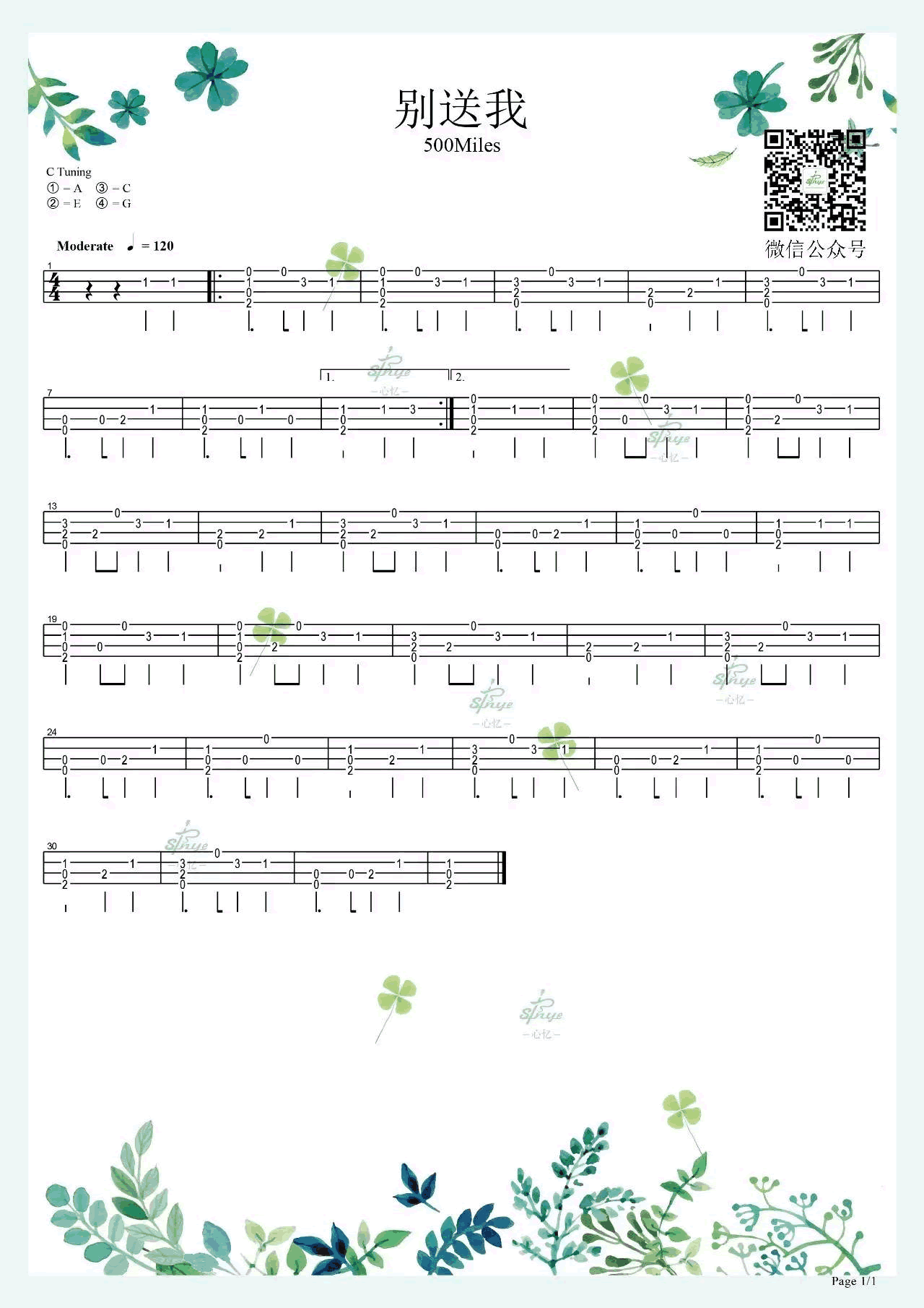 500 miles ukulele指弹谱 500 miles尤克里里指弹教学视频 时间:2017-06-30 来源:心忆尤克里里 点击:次 500 miles 尤克里里指弹谱,The Brothers Four演唱调一首经典英文歌曲,500 miles ukulele指弹谱。韩寒电影《乘风破浪》主题曲《别送我》旋律。感谢心忆尤克里里编配,四线图片谱。随谱附上ukulele指弹教学视频。