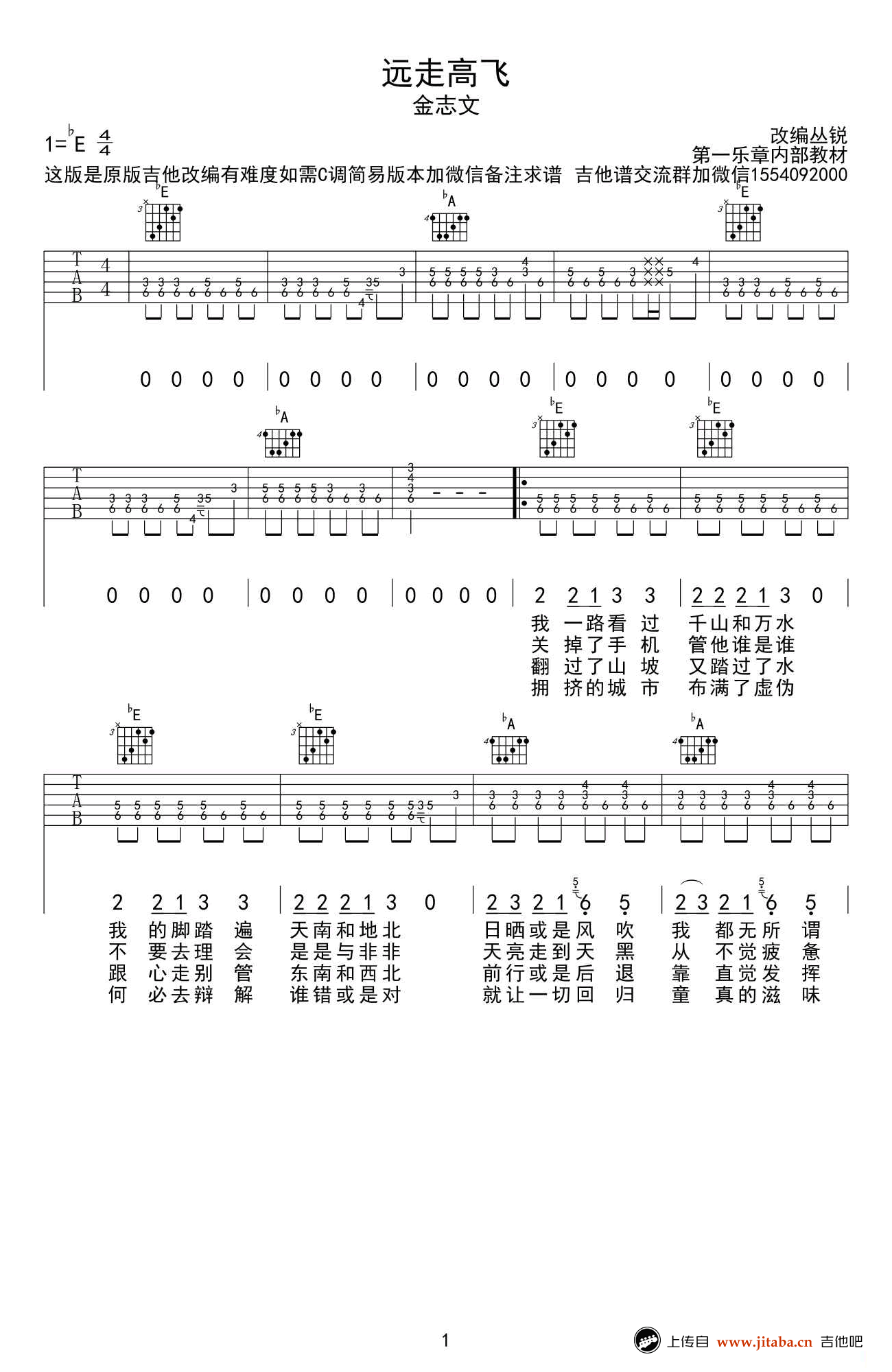 远走高飞吉他谱 金志文 原版六线谱 高清弹唱谱 时间:2017-07-04 来源:第一乐章 点击:次 远走高飞吉他谱,金志文演唱,远走高飞六线谱,原版编配,高清弹唱谱,两张图片谱例。感谢第一乐章出品,易唱网推荐收藏。一首自由的歌,唱出在旅行中的不同心境,曲风明快跳跃,歌词的描述切合旅途中的风景,每个韵脚的配合发音使得听觉达到更好的效果。金志文真假音结合的唱法,让大家耳目一新,希望你听过之后都能把发生的每一件不愉快的小事都忘掉。