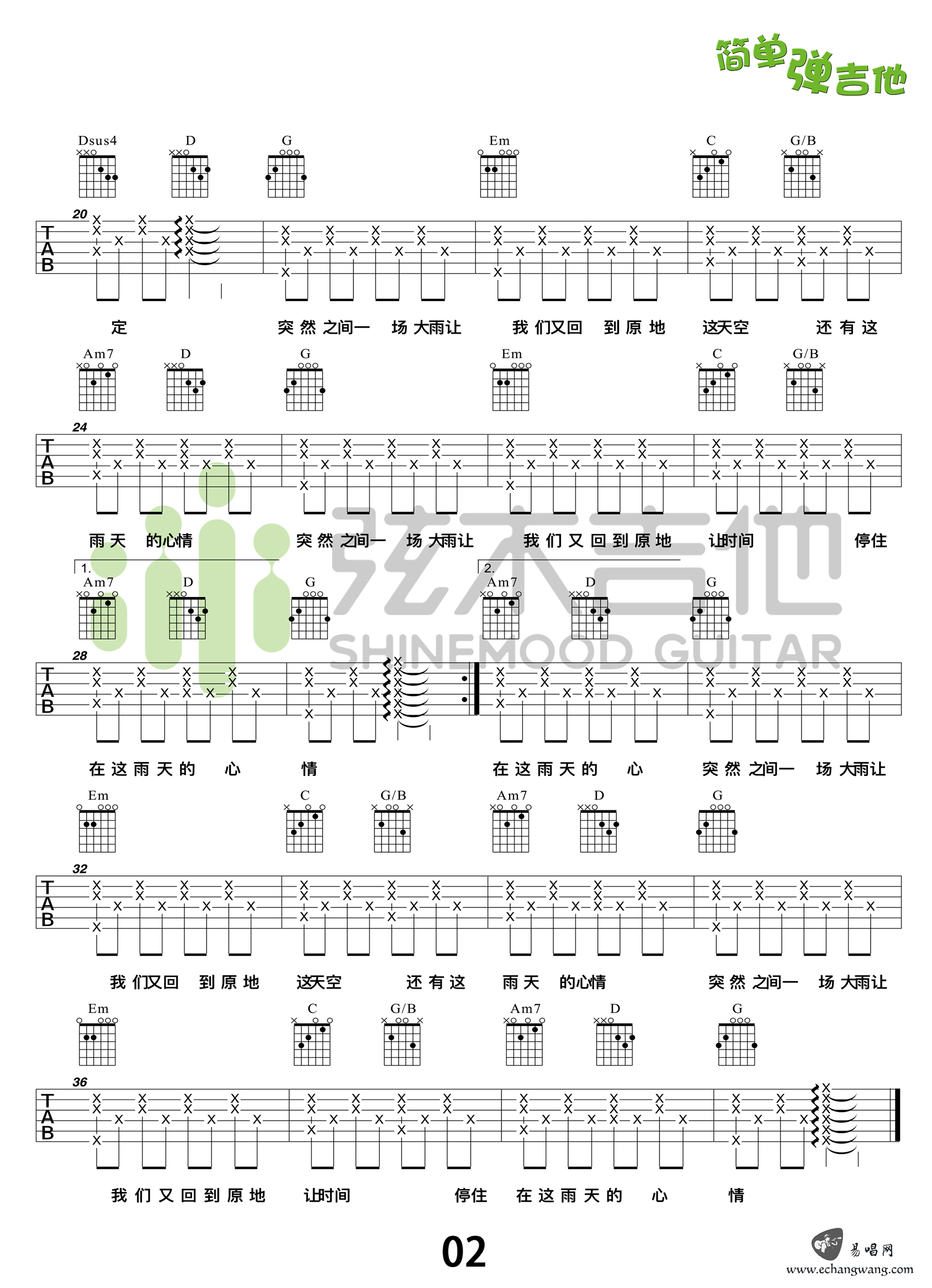莫艳琳《下雨》吉他谱 简单弹吉他 弹唱教学视频 时间:2017-07-09 来源:弦木吉他 点击:次 莫艳琳《下雨》吉他谱,简单弹吉他,六线谱高清版,两张图片谱。感谢弦木吉他张义丰老师带给大家弹唱教学示范,琴友们参照视频练习起来吧。易唱网为您提供优质曲谱,爱音乐的朋友关注收藏!